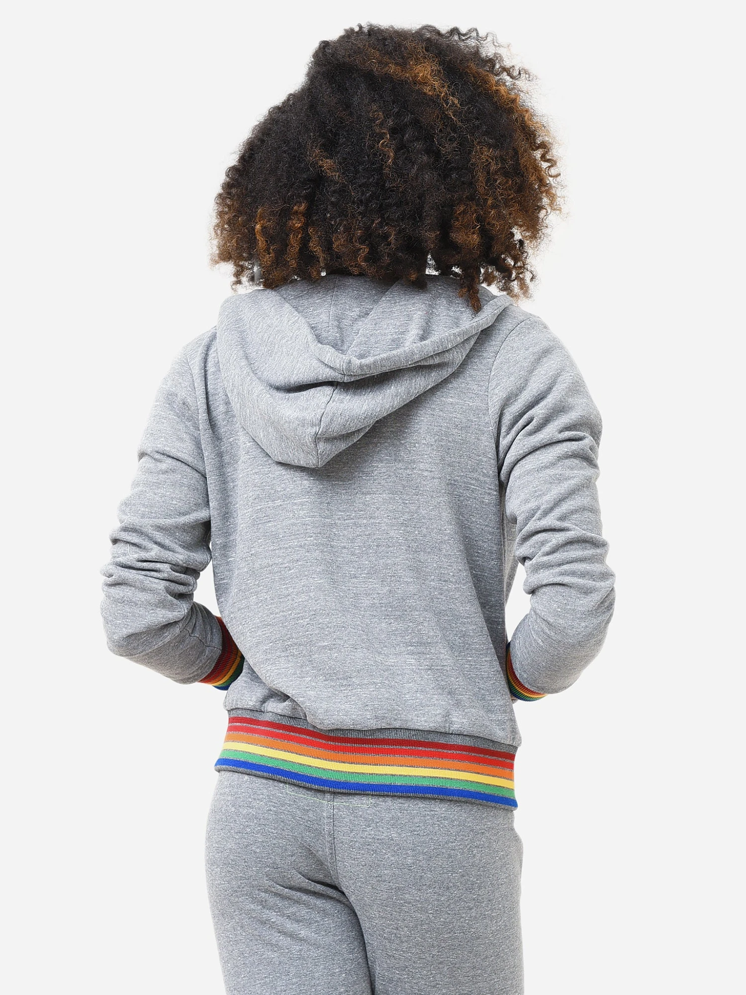 Soft zip hoodie with rainbow cuffs and hem.