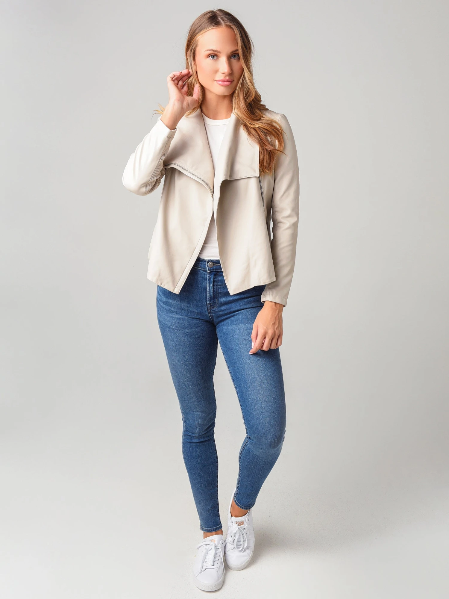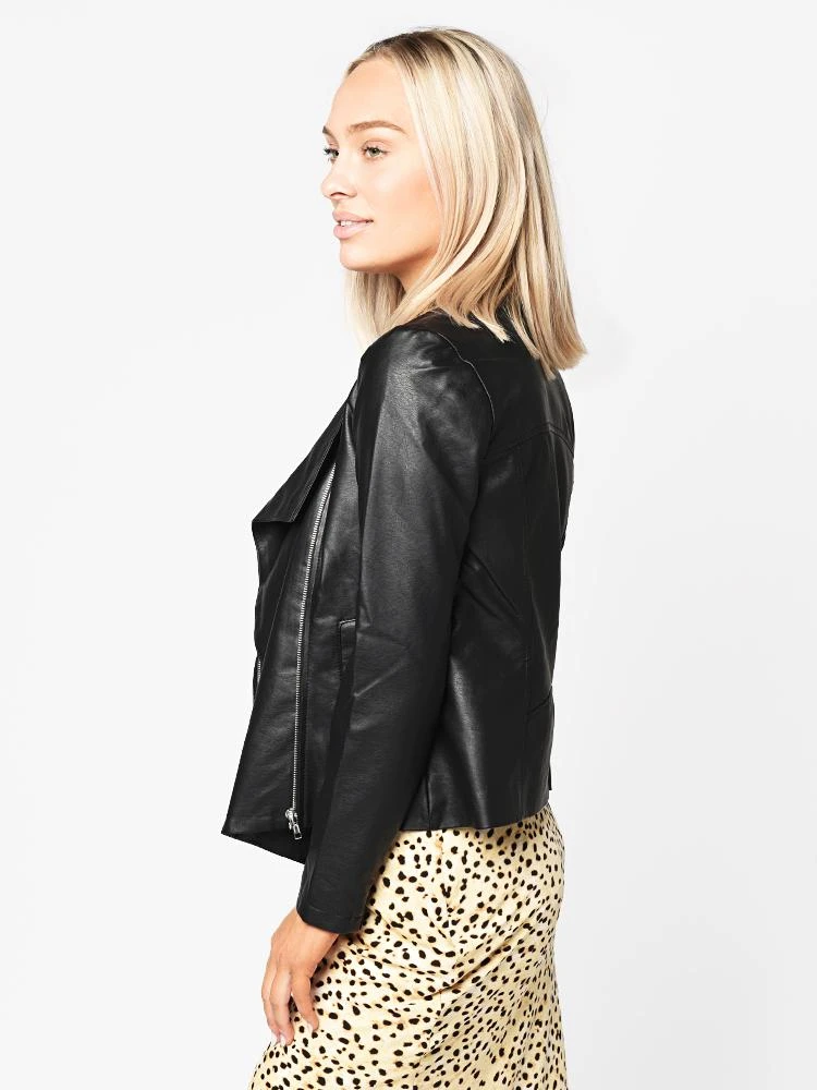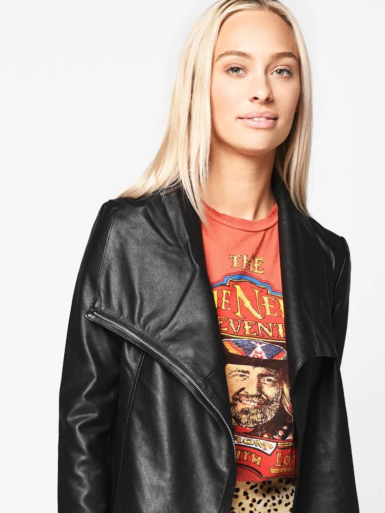 FEATURES:Biker JacketVegan Leather FabricationAsymmetrical Zipper ClosureRib-Knit Under-Sleeve DetailFold-Over Peak lapelsSuper SmoothShell: 100% Polyurethane; Lining: 100% Polyester; Trim: 100% PolyesterModel is wearing size Small jacket.Model’s Measurements: Height: 5’9″; Bust: 32B; Waist: 26″; Hips: 37.5″; Dress Size: 4 (US)