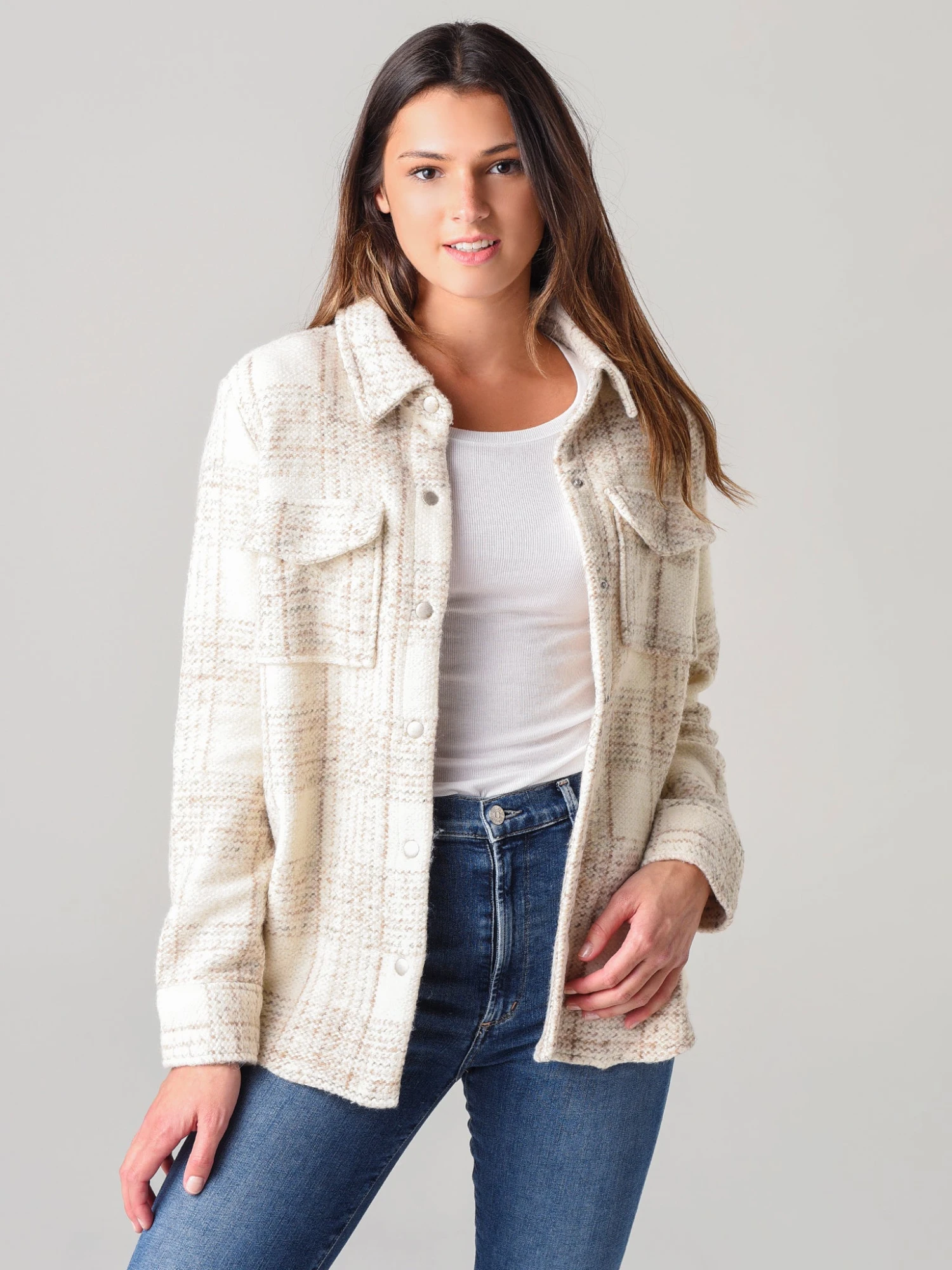 FEATURES:Knit JacketShirt CollarUtilitarian StylingButton-Down Snap PlacketTop Flap Chest PocketsButton CuffsPlaid Print65% Polyester, 21% Cotton, 14% WoolModel is wearing size Small jacket.Model’s Measurements: Height: 5’9.5″; Bust: 34A; Waist: 26.5″; Hips: 37″; Dress Size: 2-4 (US)