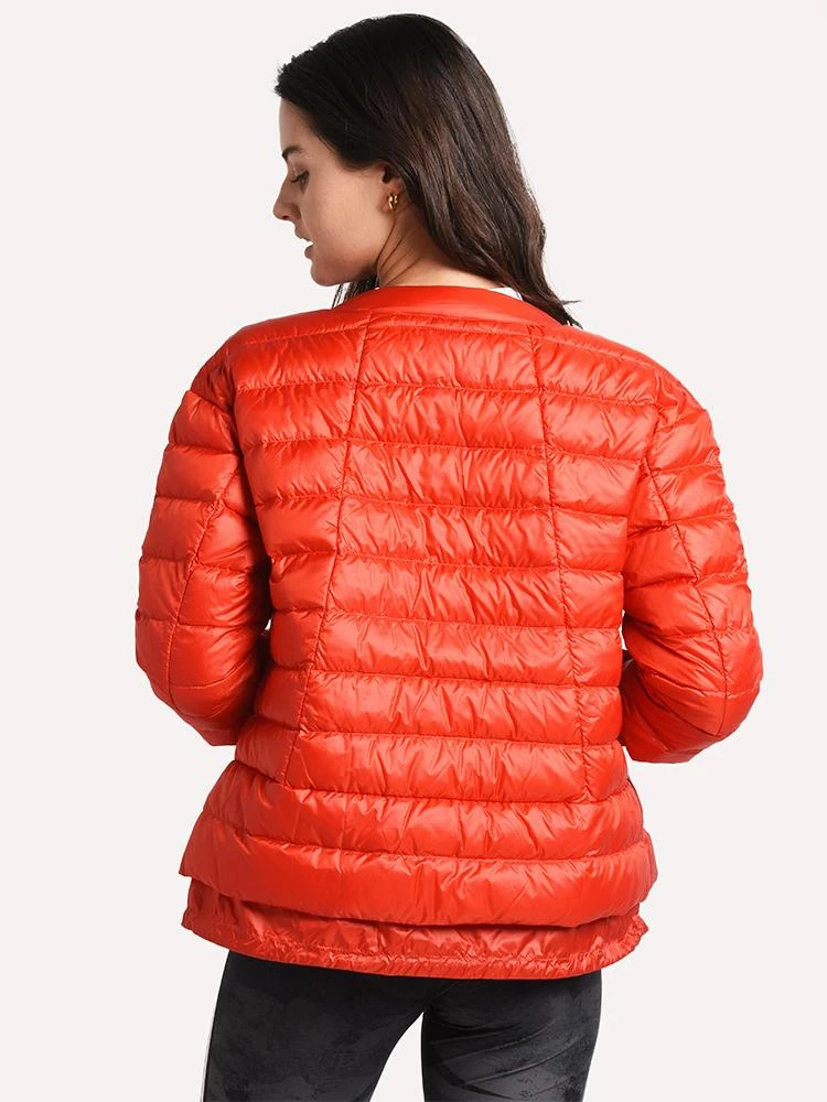 FEATURES:Lightweight down jacket in bomber jacket styleNarrow collarQuilted 3/4 sleevesNarrow cuffs finished with stretchy, decorative bandContrasting, full-length two-way zip with logo pendantsTwo bordered slash pockets at waist levelRubberised logo appliqué on the left sleeveHorizontal and oblique stitchingInsulating duck down paddingWide set-in additional hem with drawstring