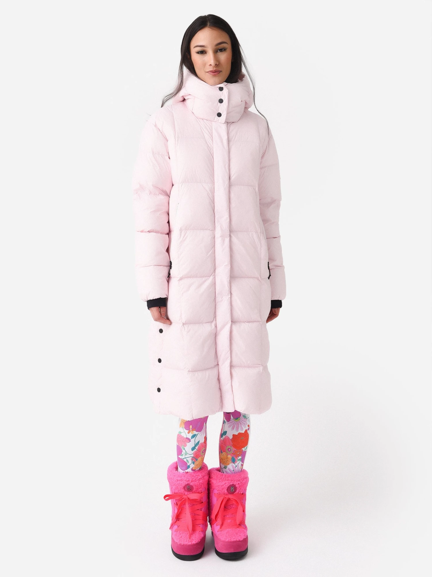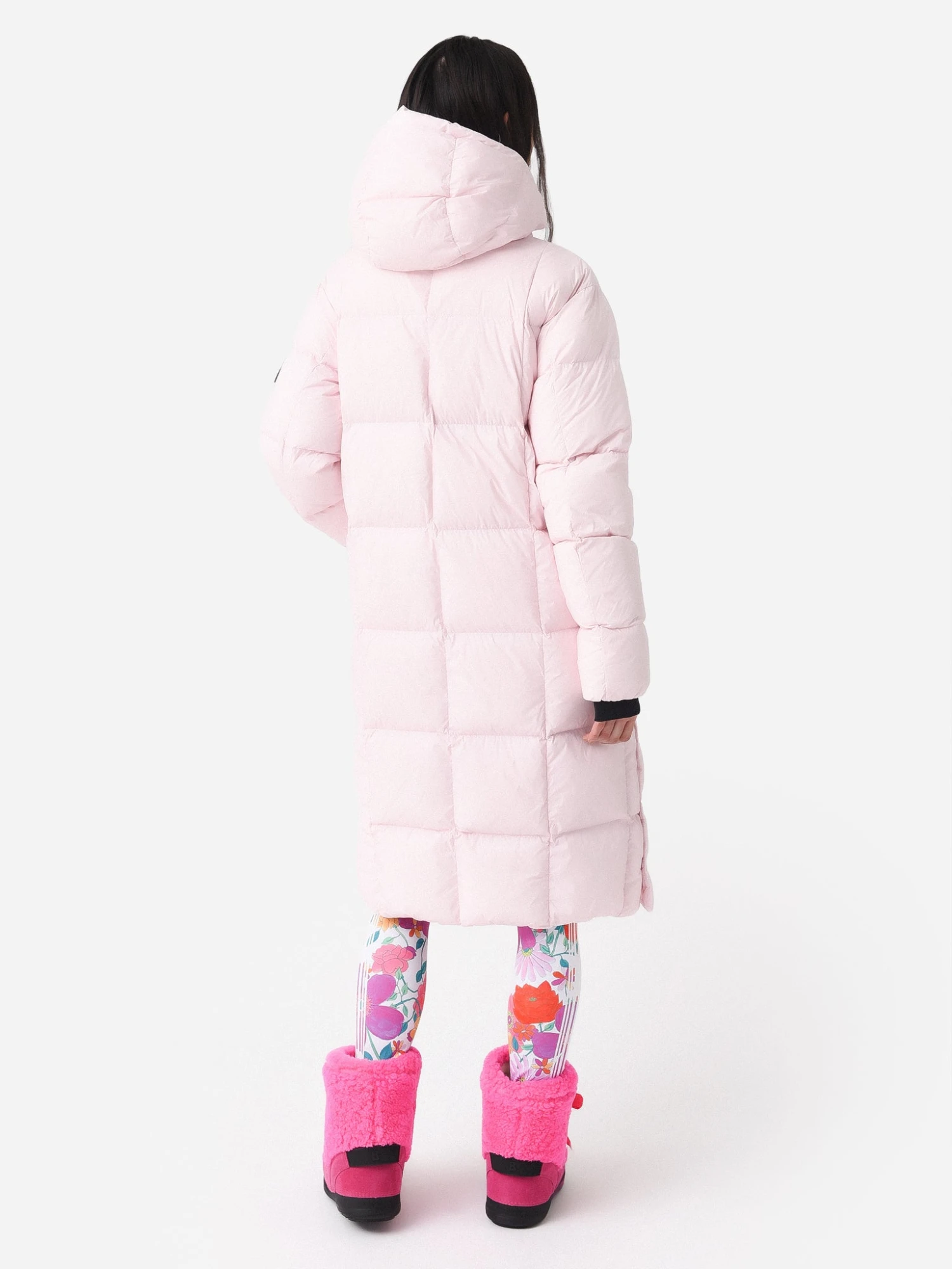 FEATURES:JacketAttached, Adjustable HoodHigh CollarLong Sleeve with Wrist GaitersSide Pockets, Interior PocketZip Closure with Button PlacketWater-Repellent FinishLong SilhouetteLength: 41 in.Straight HemQuilted FabricationShell: Nylon Blend | Fill: Duck Down + Synthetic MicroMaxâ„¢, Down Fill Power: 630Relaxed FitModel is wearing size 6 jacket.Model’s Measurements: Height: 5’9″ | Bust: 32B | Waist: 24″ | Hips: 36″ | Dress Size: 2 (US)