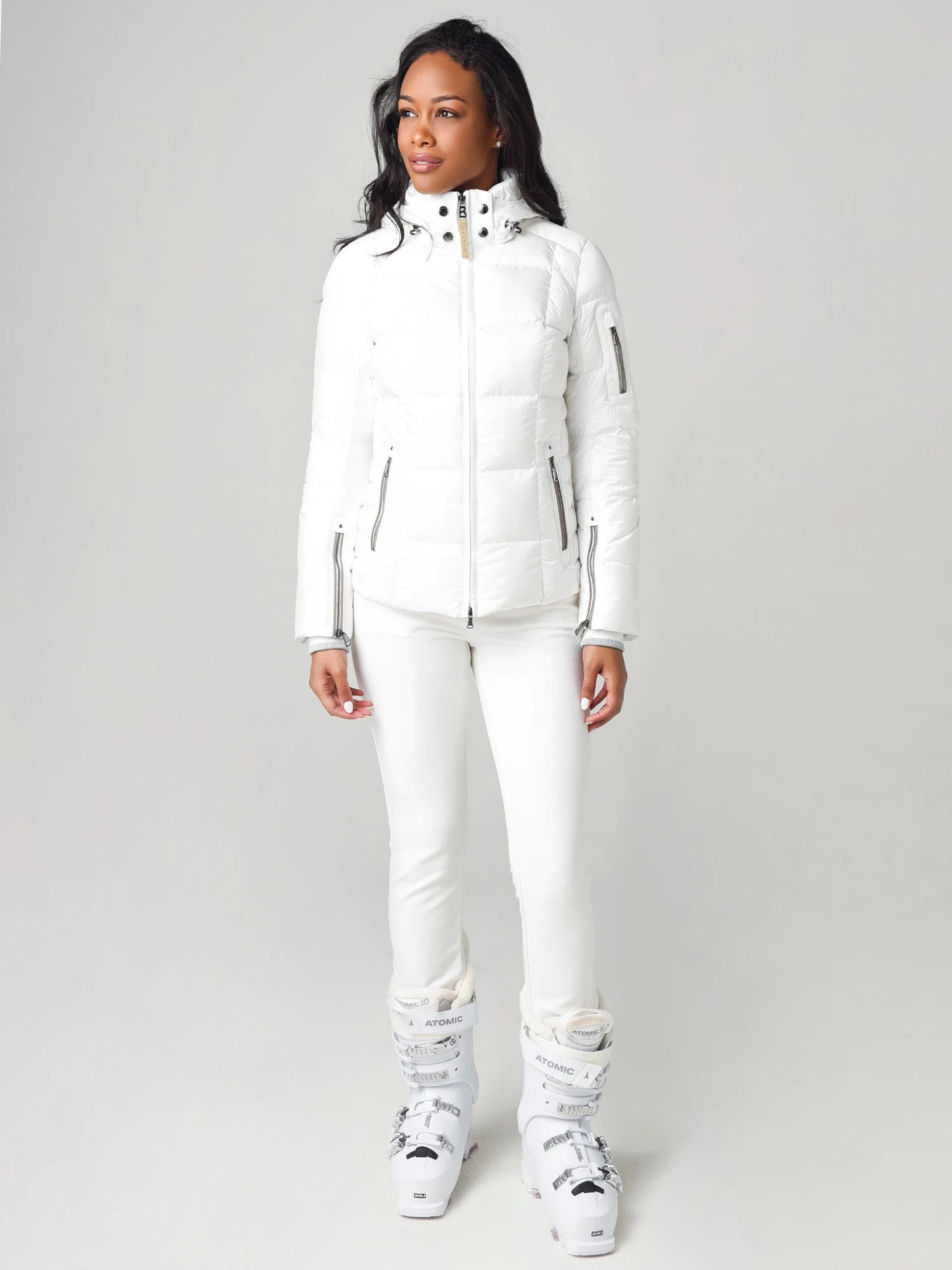 FEATURES:Down Ski JacketStand-Up Collar with Chin-GuardAdjustable, Removable HoodWind-Resistant Placket2-Way, Full-Zip ClosureAlcantara Suede TrimSize Zipper Pockets, Inside PocketsPowder SkirtWrist Gaiters and Knit CuffsRipstop FabricationWaterproof, Wind-Repellent, Down InsulatedModel is wearing size 4 jacket, size small baselayer and size 6 pant. Model’s Measurements: Height: 5’9″; Bust: 32B; Waist: 25.5″; Hips: 36.5″; Dress Size: 4 (US)