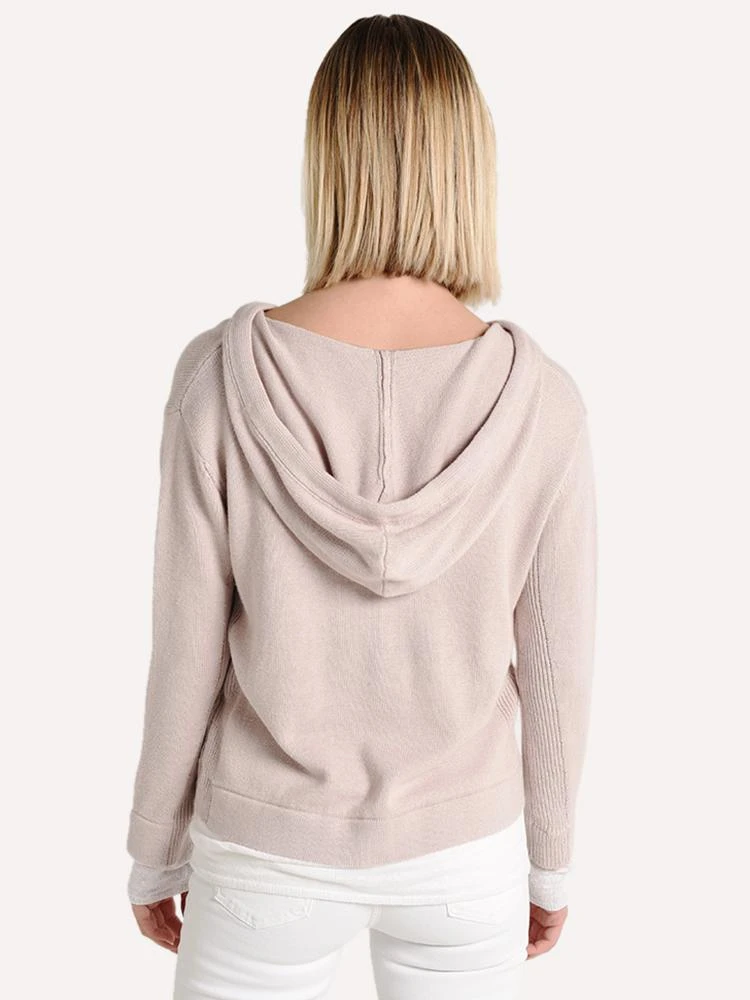 FEATURES:Fine Knit Cotton Cashmere Blend HoodieRelaxed FitDropped ShoulderV-NeckDrawstrings at HoodLayered Hem and CuffsContrast Ribbed Knit Sides and Under Sleeve72% Cotton, 13% Cashmere, 15% LinenStyled with Citizens of Humanity jeans style # 1664C-799 and Binge sandals Style # KAIPS. Model is wearing size Small hoodie and size 25 jeans.