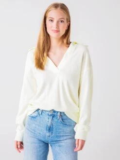 FEATURES:SweatshirtCollared, V-NecklineDropped-ShoulderPuff SleeveHeathered DetailBanded Hem and CuffsRelaxed Fit100% PolyesterModel is wearing size Small sweatshirt.Oatmeal Heather: Model’s Measurements: Height: 5’10”; Bust: 32C; Waist: 25″; Hips: 35″; Dress Size: 0 (US)Pale Yellow: Model’s Measurements: Height: 5’9.5″; Bust: 32C; Waist: 26″; Hips: 35.5″; Dress: 2 (US)