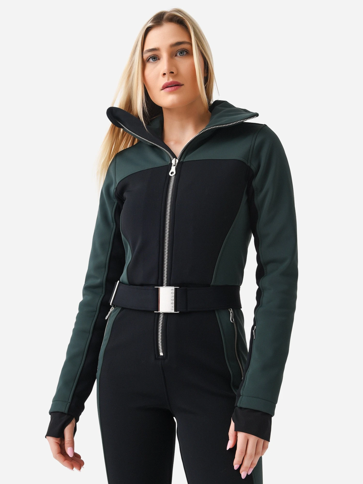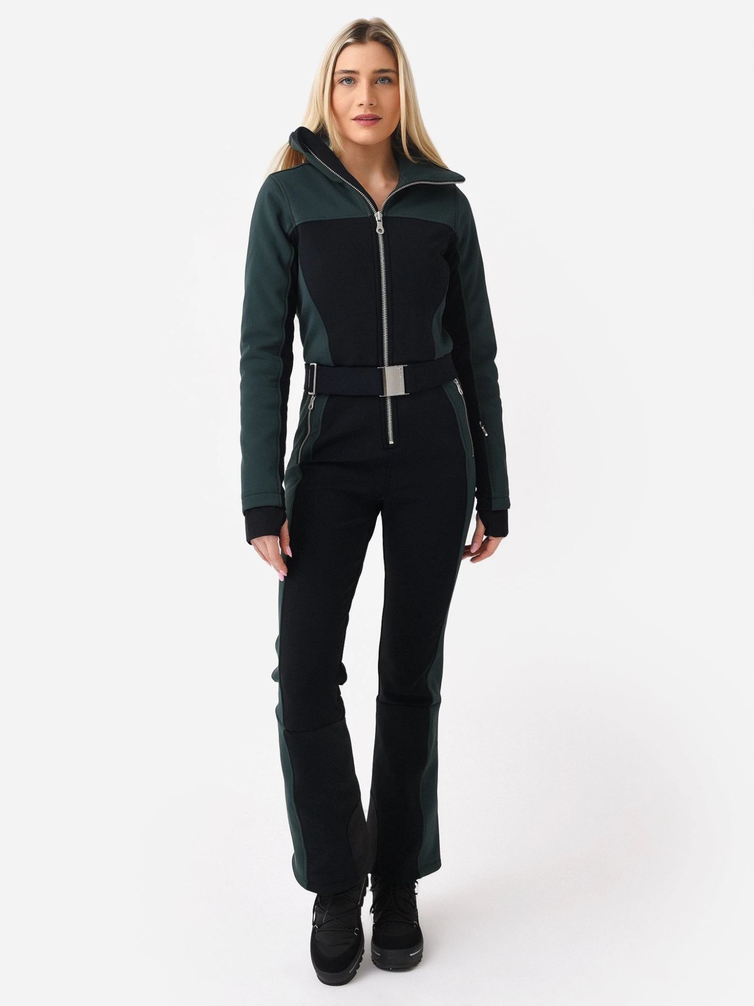 Softshell ski suit with a large collar, a belted waist, and a straight-leg silhouette.
