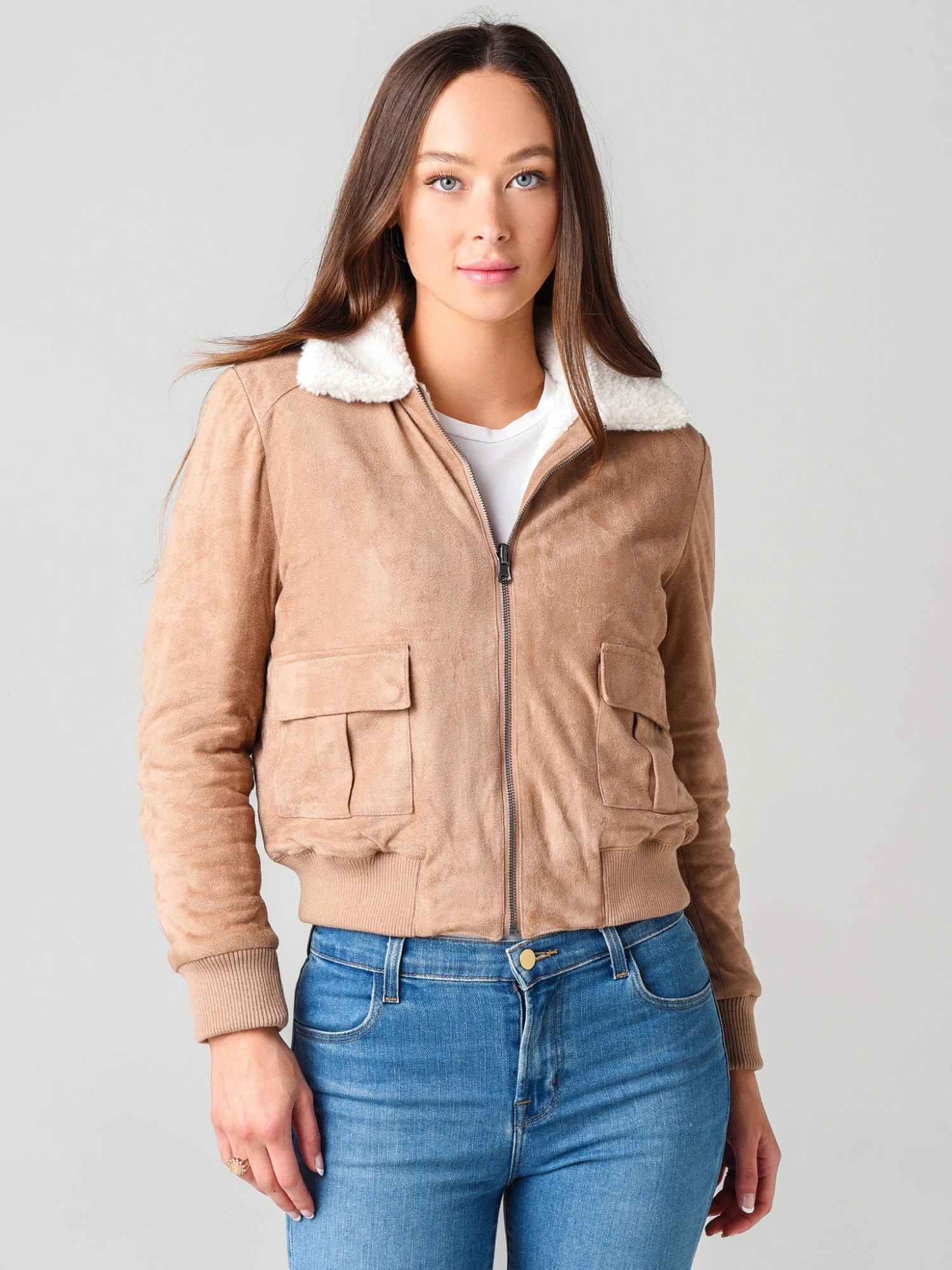 FEATURES:Zipper closure Faux shearling collar Front patch pockets Ribbed cuffs and hemCropped Faux suede90% Polyester, 10% Elastane Model is wearing size small jacket, size small tee and size small 26 jean. Model’s Measurements: Height: 5’10.5″; Bust: 32C; Waist: 25″; Hips: 36″; Dress Size: 4 (US)