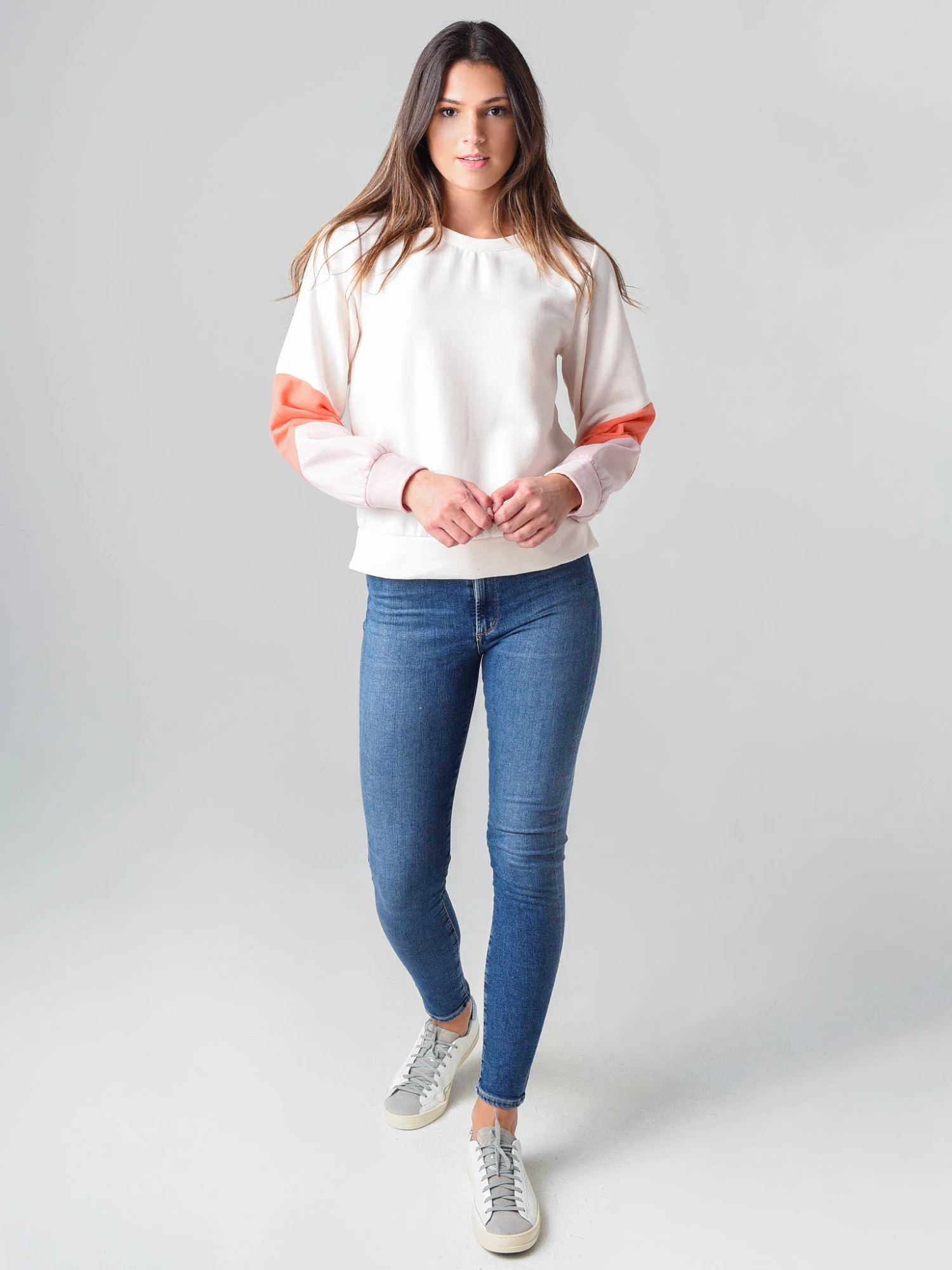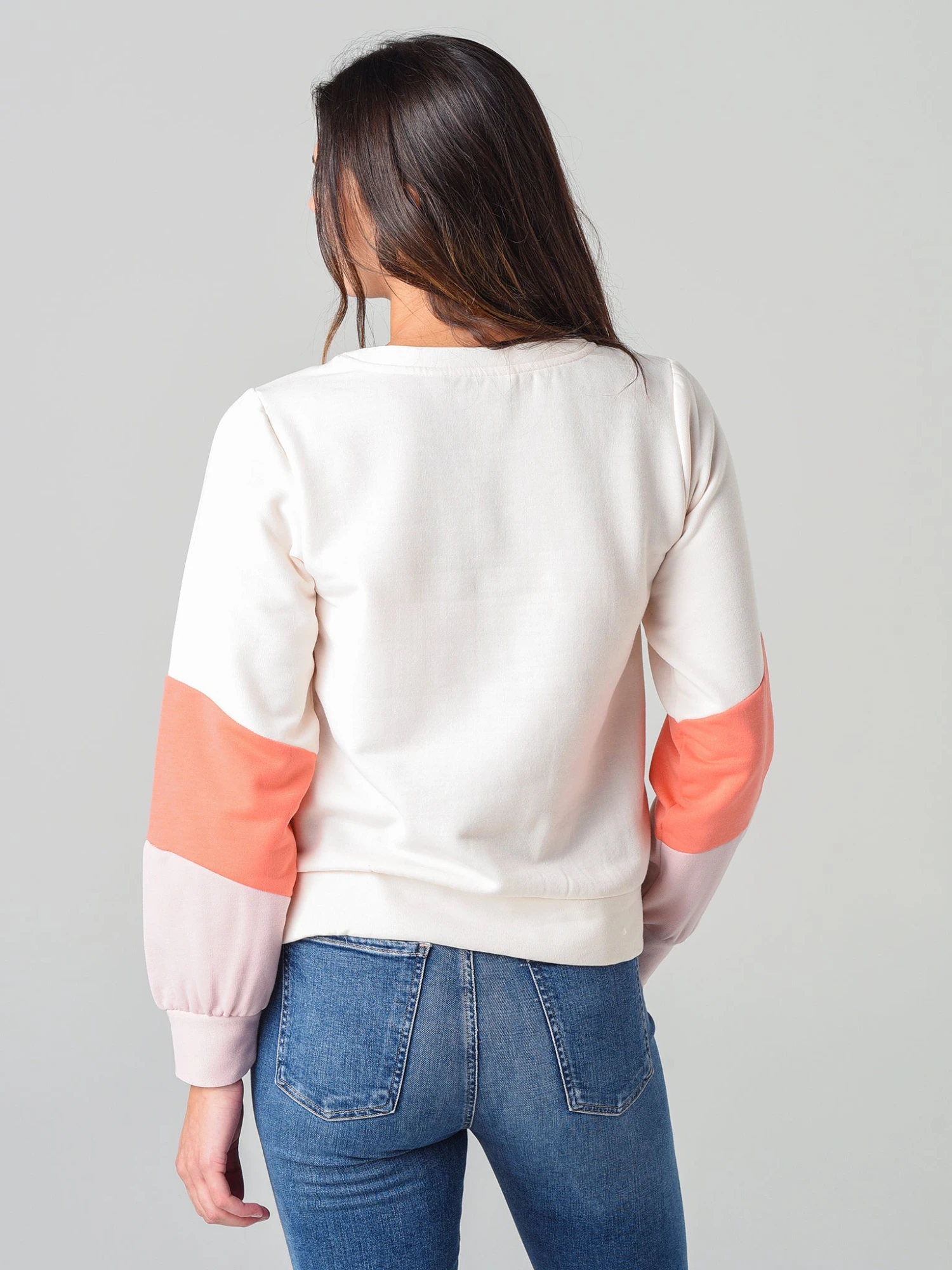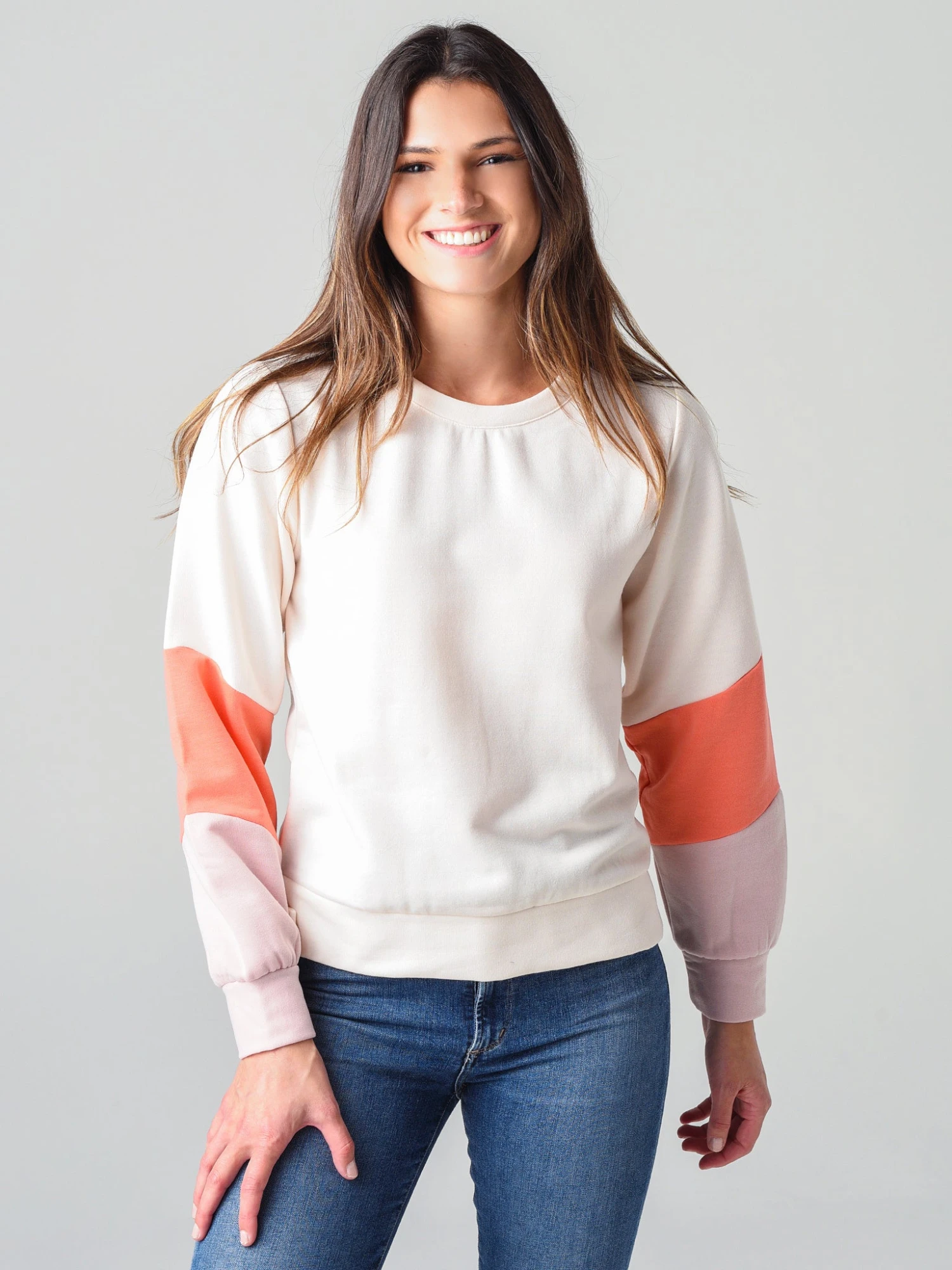 FEATURES:Pullover SweatshirtCrew NecklineColor-Blocked DesignBanded Neck, Cuffs and HemSide SlitsSuper Soft97% Polyester, 3% ElastaneModel is wearing size Small sweatshirt.Model’s Measurements: Height: 5’9.5″; Bust: 34A; Waist: 26.5″; Hips: 37″; Dress Size: 2-4 (US)