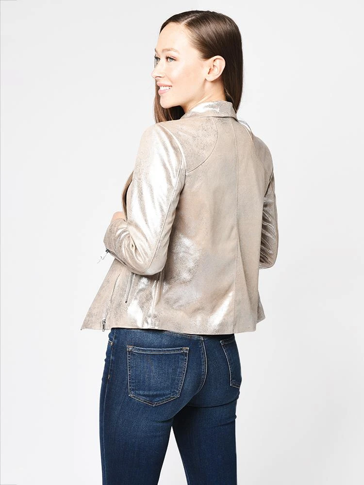 FEATURES:Women`s BlazerMetallic FinishOversized draped LapelsOpen FrontZipper PocketsFaux Suede: 100% Polyester; Lining: 100% PolyesterStyled with Citizens of Humanity tee style # 9119-1034 and J Brand jean style # 23110O208. Model is wearing size Small jacket, tee and size 26 jean.