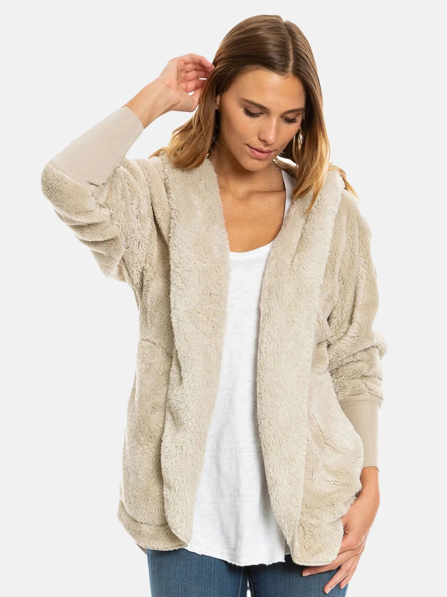 Feels like a cloud. Made with premium luxe two-sided soft plush sherpa. This casual, oversized cozy jacket is offered in 3 sizes with a hoodie shawl collar, cover stitch for added flair, and hand warming pockets.