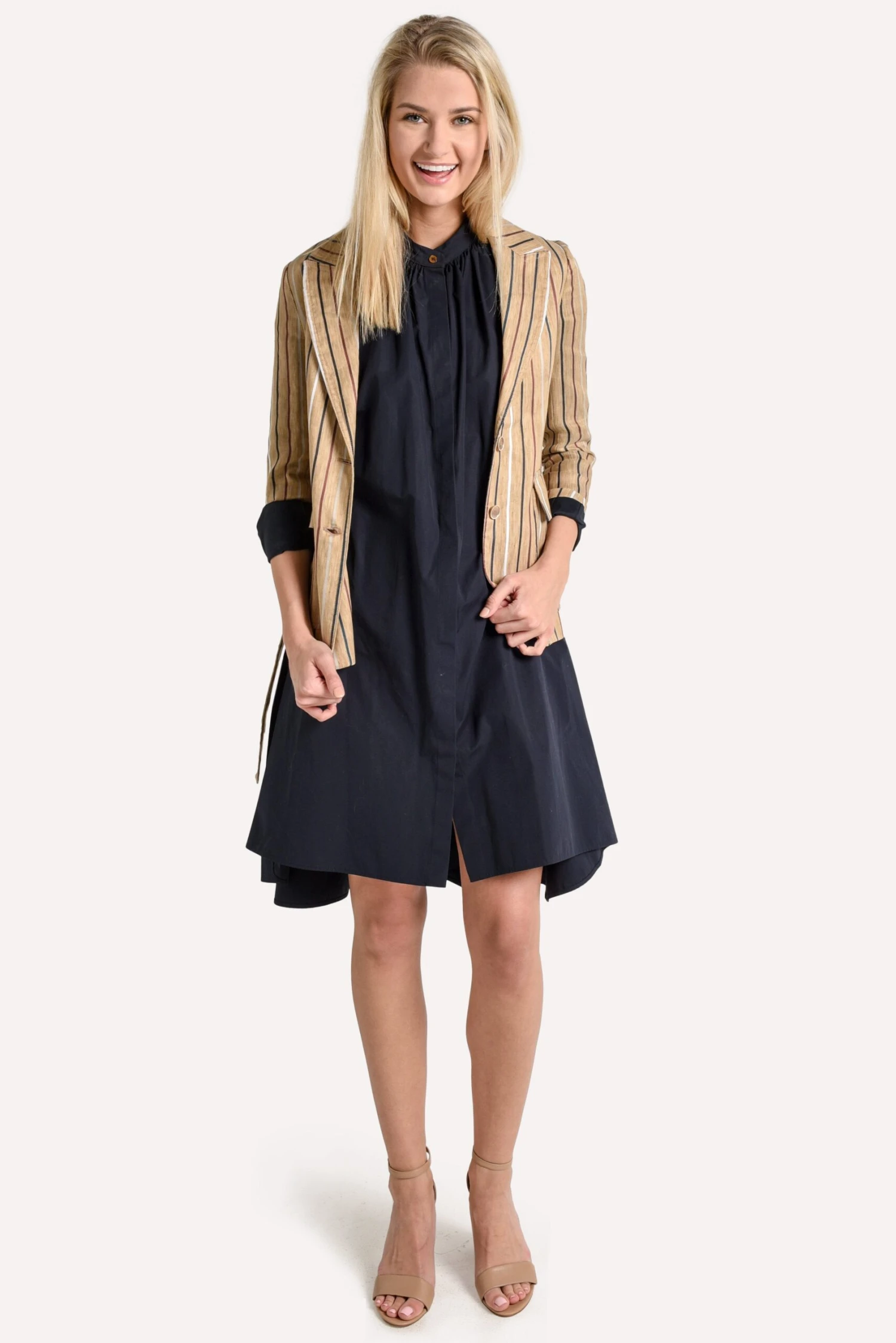FEATURES:Single breasted modelPeak lapelFlap pocketsBack cutBelt at waistButtons on cuffsUnlinedFlax: 100%Model is wearing size 0 jacket. Styled with Eleventy Summer Dress style # 980AB0031 ABI27001.