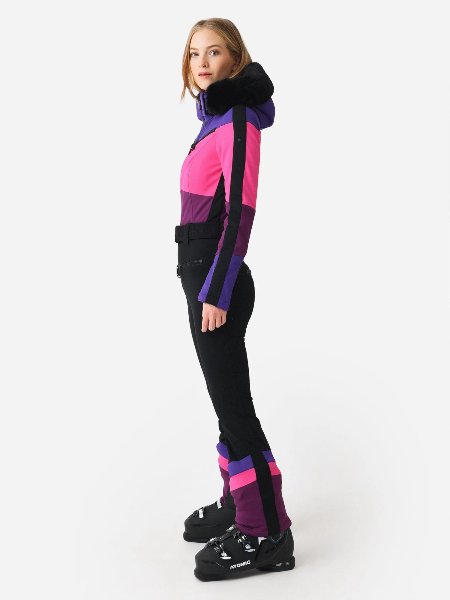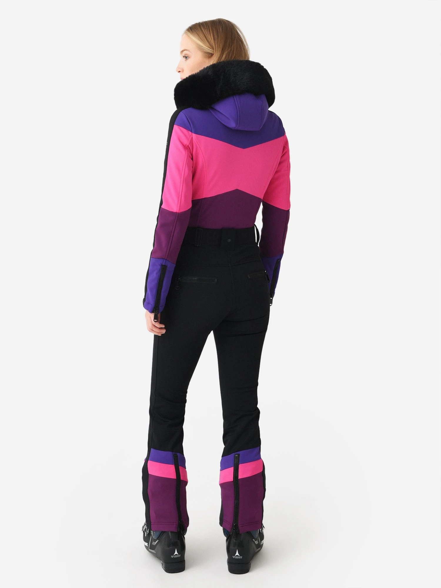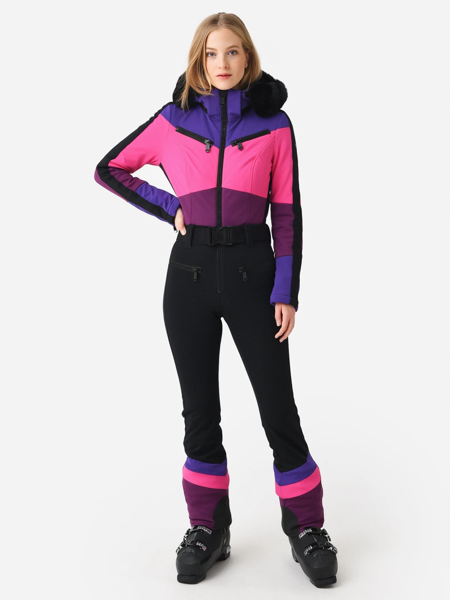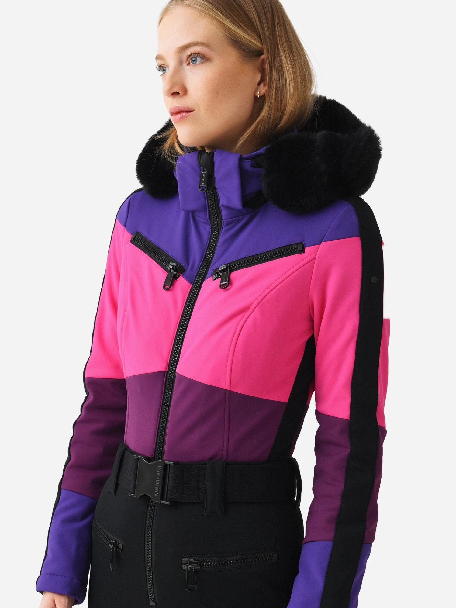 Softshell ski suit with a faux fur trimmed hood and multiple pockets.