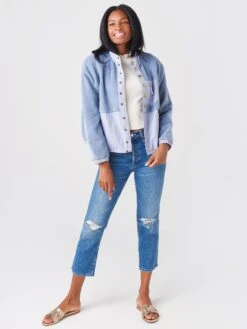 FEATURES:Button front Front pockets with Button closures Peplum hemline Boxy fit 100% cotton Imported Styled with Agolde jeans Style # A003B-2070, ATM tee Style # AW1145-FK1 and Superga sneakers Style # S00BC30. Model is wearing size small jacket, size small tee and size 26 jean.