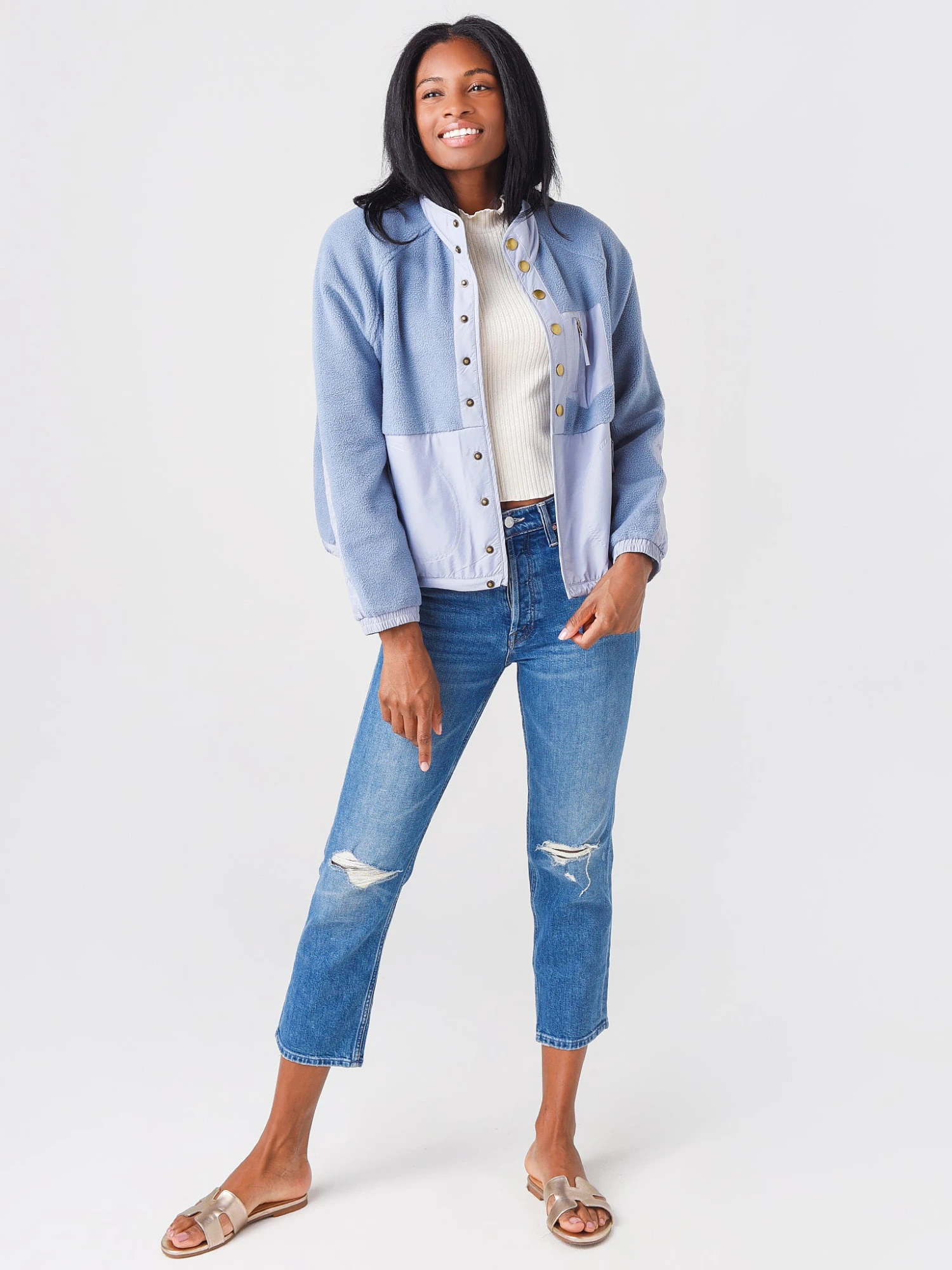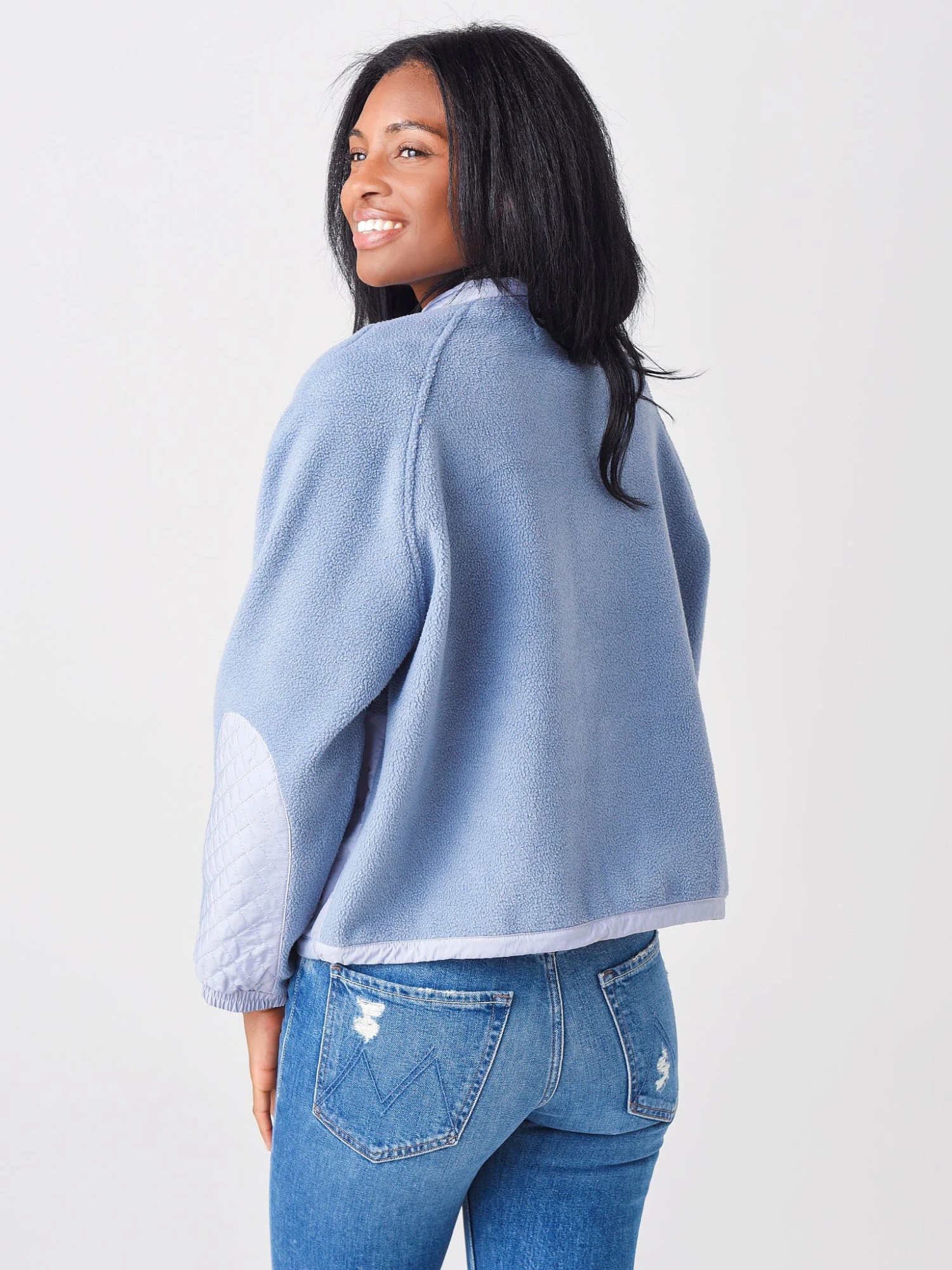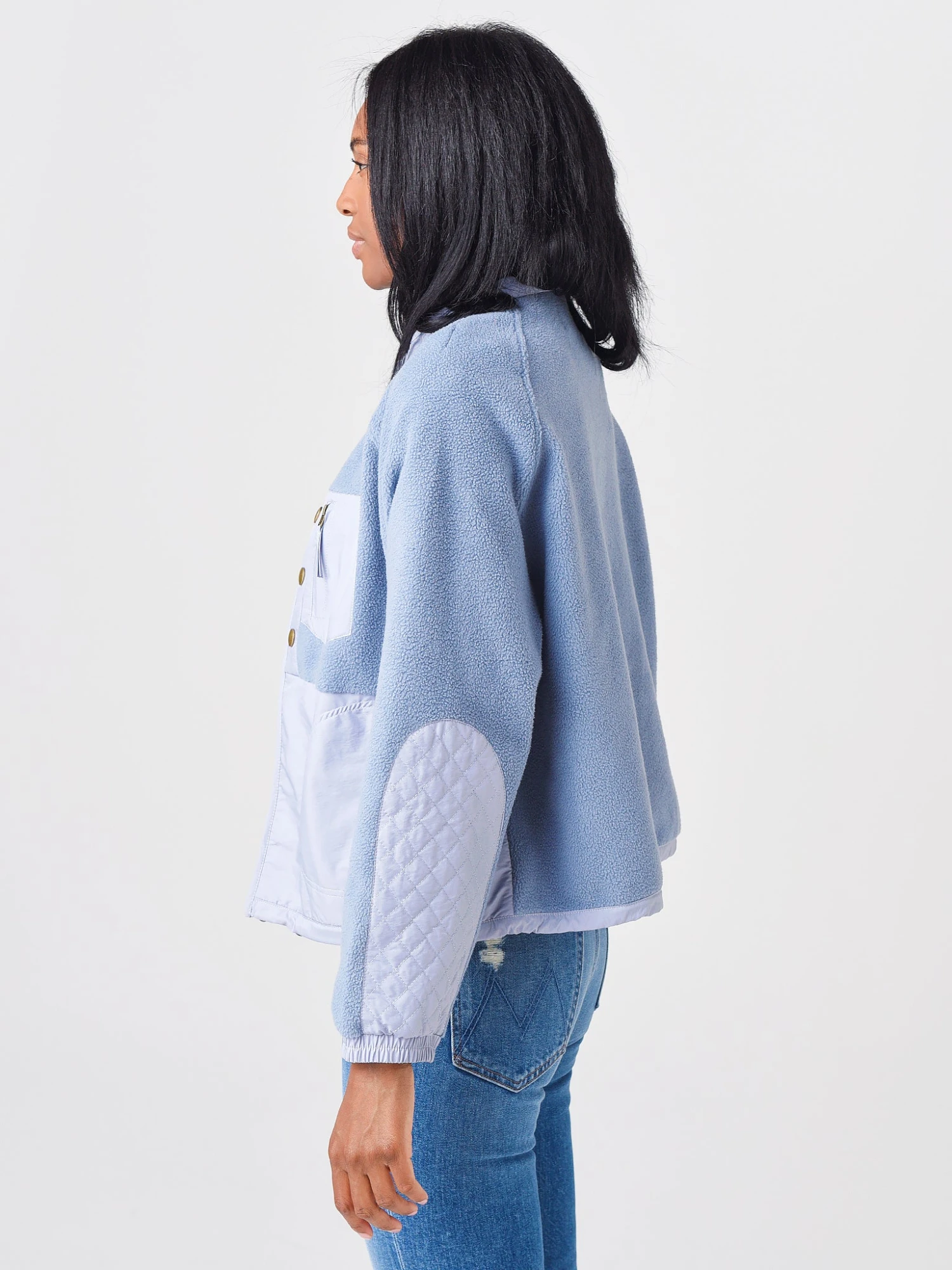 FEATURES:JacketStandard CollarSnap ClosureElastic Cuffs and HemBrushed FleeceContrast Fabric Trim DetailRelaxed FitShell: 68% Cotton, 32% Polyester | Trim: 70% Polyester, 30% CottonModel is wearing size Small jacket.Model’s Measurements: Height: 5’10” | Bust: 34B | Waist: 25.5″ | Hips: 36.5″ | Dress: 2-4 (US)