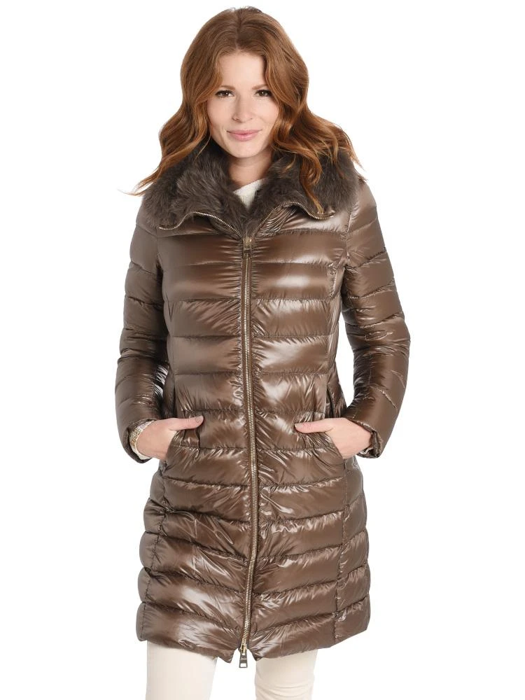 FEATURES:Approx. 34 L down center back.Spread collar; two-zip front.Removable fur collarLong sleeves.Fitted shape.Nylon shell/lining.90/10 goose down/feather fill.Made in Romania.Styled with AG Jeans Style # 0SV1379 and Vince Style # C5000L1. Model is wearing size 26 jean and 42 jacket.