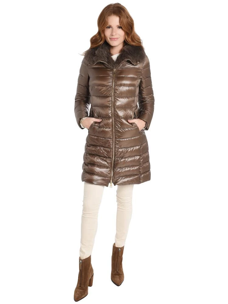 The Herno Long Fitted Nylon Coat With Big Fox Collar is a chic look with fur trim.