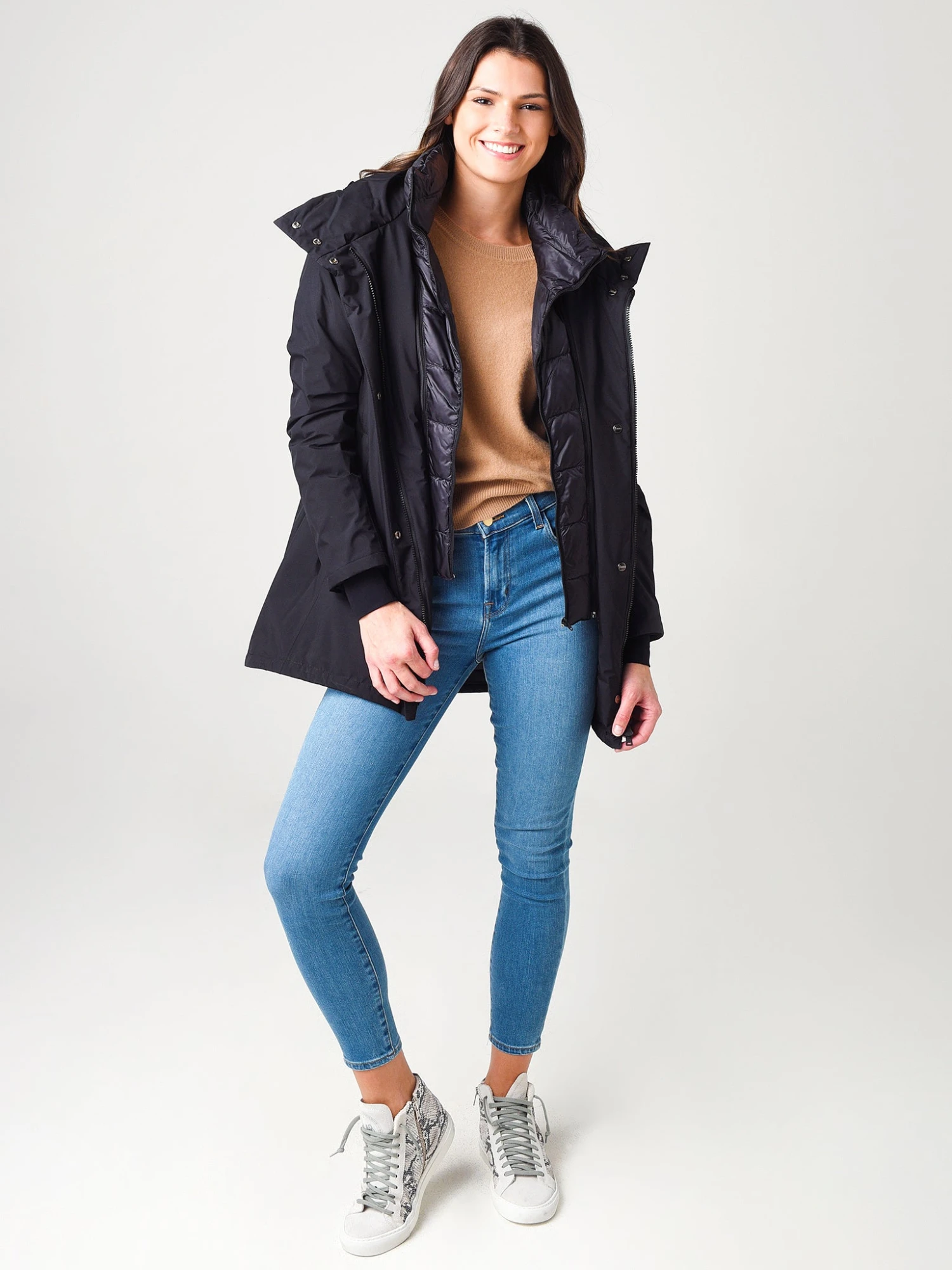 FEATURES:Down JacketStand-Up Collar with Chin-GuardRemovable, Adjustable Hood with DrawstringRemovable, Adjustable WindguardTaped SeamsWindproof and WaterproofPolyurethane Coated, 2-Way Zip and Wind-Resistant with Concealed Press StudsAdjustable Drawstring HemElasticized Inner CuffsA-Shape SilhouetteGore-Tex 2-Layer ConstructionExternal: 100% Polyester; PTFE MembraneModel is wearing size 42 coat.Model’s Measurements: Height: 5’9.5″; Bust: 34A; Waist: 26.5″; Hips: 37″; Dress Size: 2-4 (US)