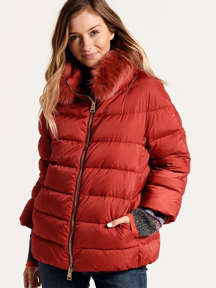 The Herno Women’s Sateen Short Cocoon Jacket with Fur Collar is a chic look while keeping you warm.