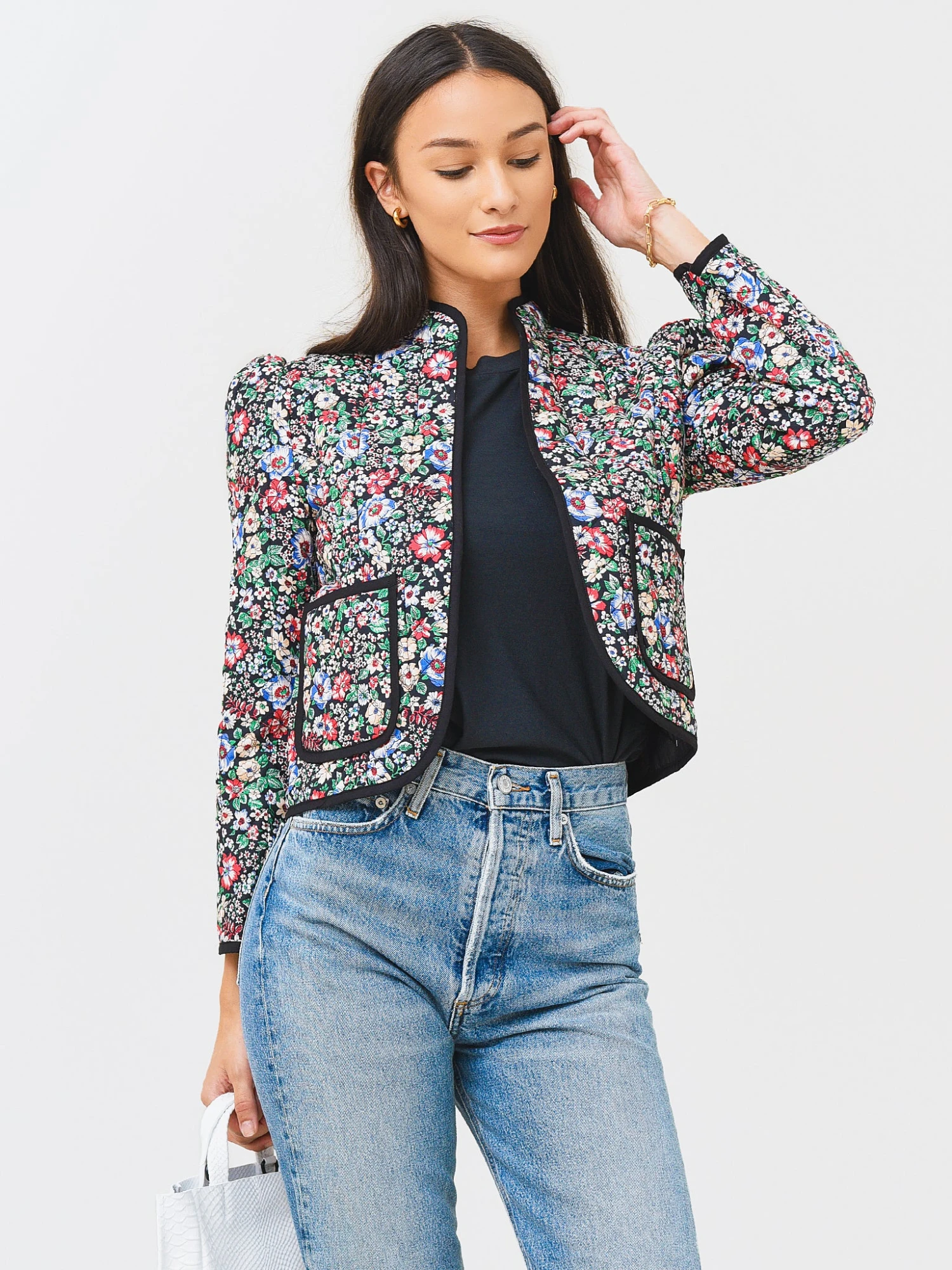 FEATURES:JacketStand-Up CollarPuffed ShoulderLong SleeveFont Patch PocketsOpen FrontContrast TrimAll-Over Floral PrintSlight Cropped SilhouetteLightweight Fabrication100% CottonClassic FitModel is wearing size Small jacket.Model’s Measurements: Height: 5’9″ | Bust: 32B | Waist: 24″ | Hips: 36″ | Dress Size: 2 (US)