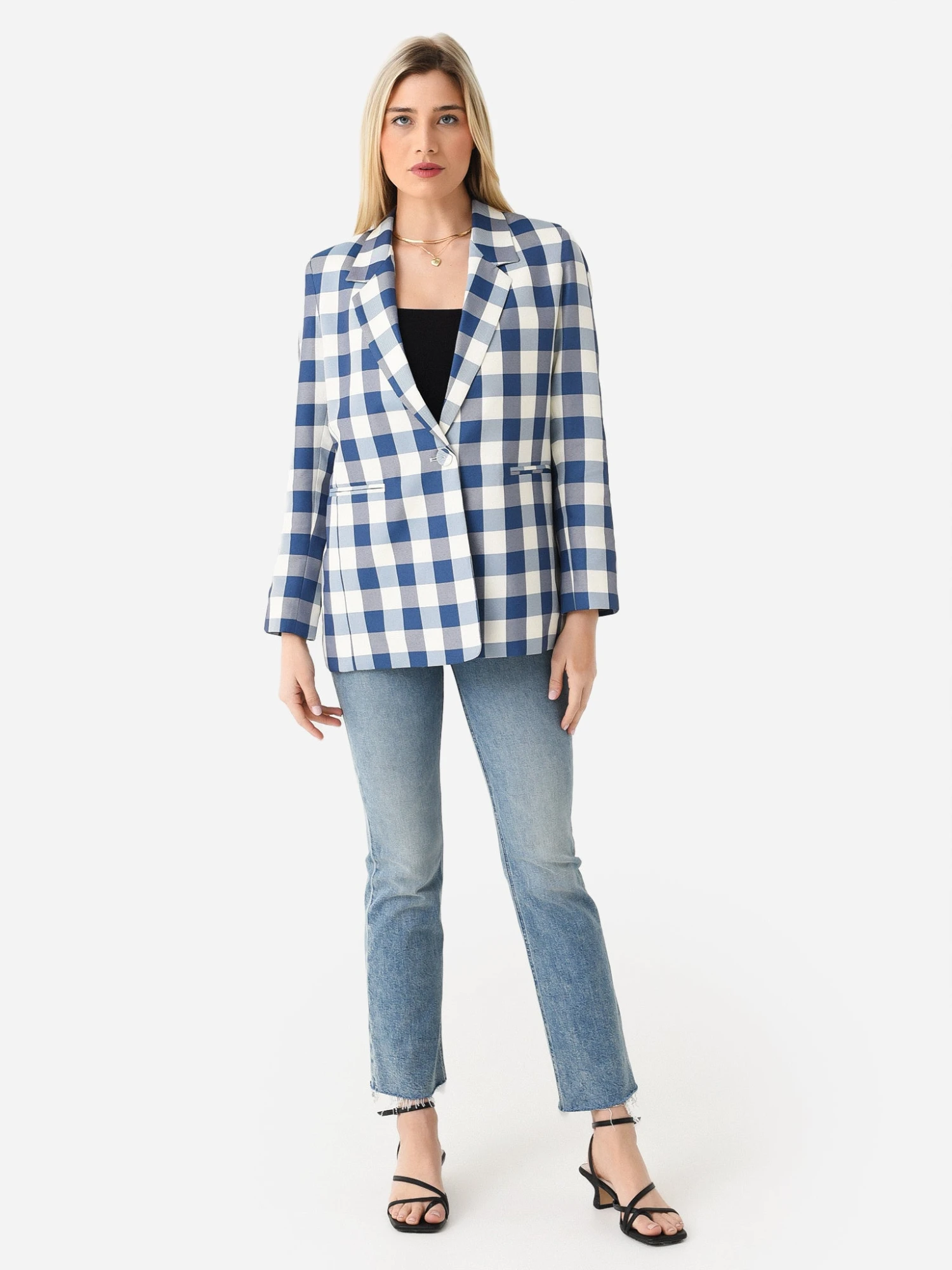 Checker-printed blazer with a notch lapel and welt pockets.