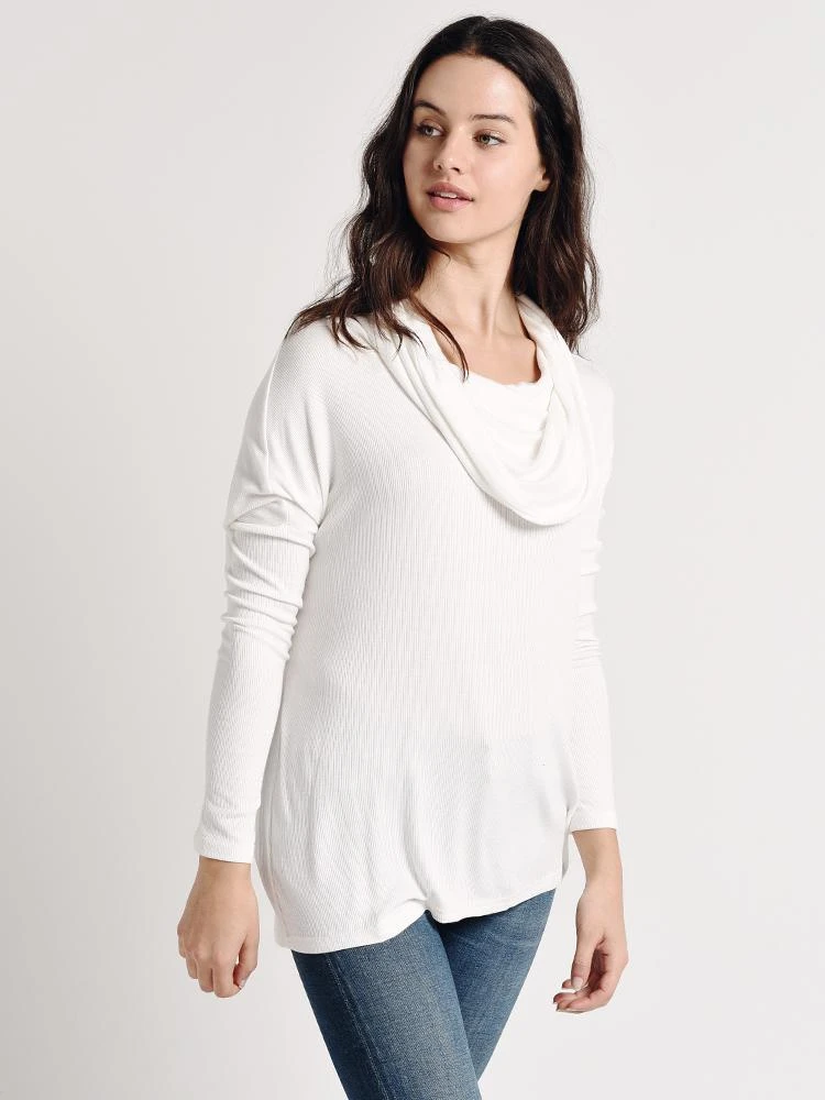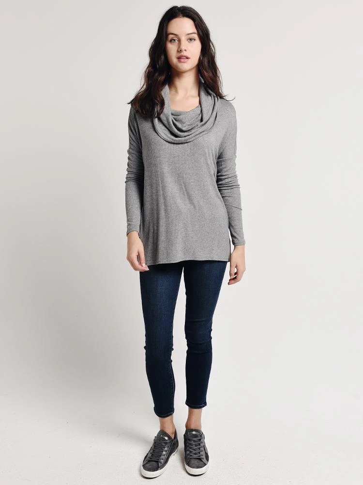 FEATURES:Long-sleeve pullover in a stretch rayon rib knit.Easy fit.Cowl neckline.Seamed back.Dropped shoulder seams.Dropped shoulder seams.97% rayon, 3% spandex.Hand wash and dry flat.Imported.Styled with Citizens of Humanity Jeans Style # 1416C-989, BB and Philippe Model Style # CLLD-XY04. Model is wearing small vest, sweater and 26 jean.