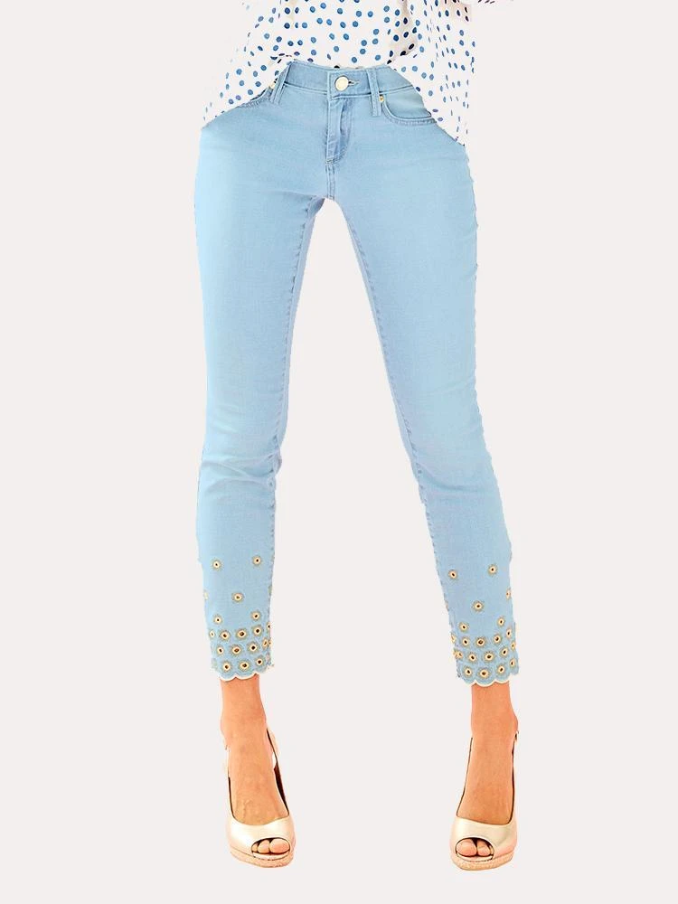 Because our goal is to make everything in life more fun. We’ve taken a regular skinny jean and made it more exciting with a scallop hem and gold detailing on the legs.Â