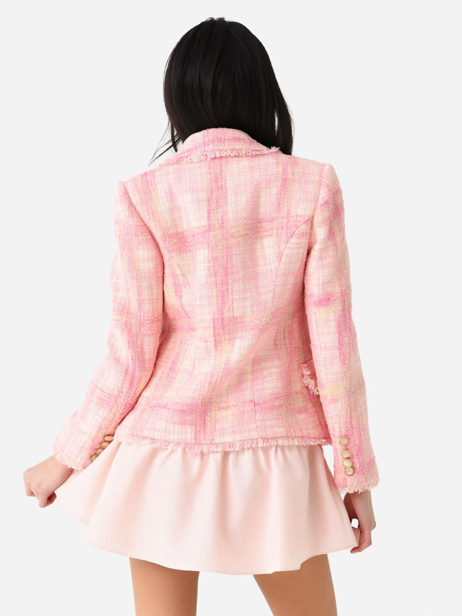 FEATURES:BlazerPeak LapelLong SleeveFlap PocketsButton ClosureFringe TrimAll-Over Novelty PrintTweed Fabrication43% Wool, 54% Acrylic, 3% PolyesterClassic FitModel is wearing size 2 blazer.Model’s Measurements: Height: 5’7.5″ | Bust: 32C | Waist: 25″ | Hips: 35″ | Dress Size: 0-2 (US)