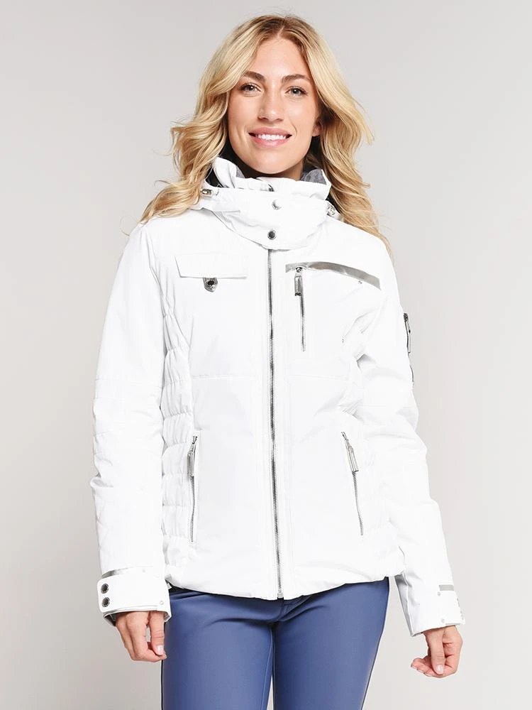 FEATURES:YKK Metaluxe zippersExtra soft fleece-lined collarRemovable and 2-way adjustable hood Interior electronics pocket with cord routing portRuching at side panelsStretch inner cuffsAdjustable sleeve cuffsAdjustable interior hem drawcordIntegrated Powder Skirt with Snap-Away Feature Insulation: Thermore Classic FE Insulation 200gm Body, 150gm Side Body, 115gm SleeveFabric: Black, White, Resort at Midnight: HydroBlock Sport 100% Polyester Plain Weave; Pool Party, Honeysuckle BandW: HydroBlock Sport 100% Polyester Satin TwillStyled with Obermeyer pants Style # 15015. Model is wearing size 8 jacket and pant.