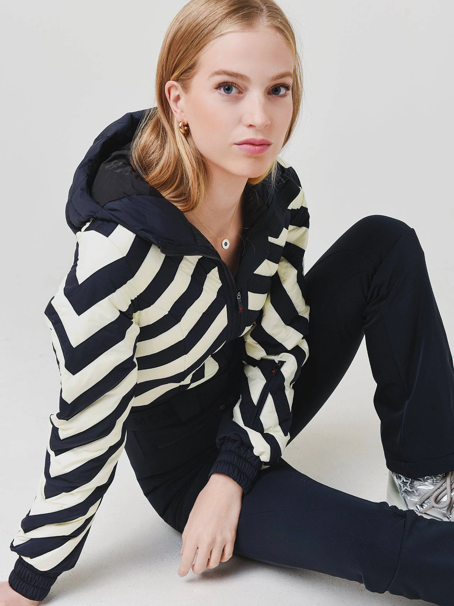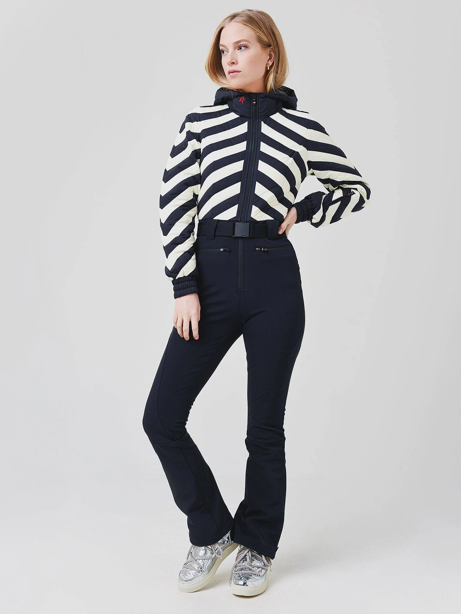 FEATURES:Ski/Snowboard SuitHigh Collar w/ HoodLong Sleeve w/ Ski Pass PocketFull Zip FrontWaist BuckleFront Zip PocketsSnap-Closure Extendable Flare Bottom w/ ZipElastic Inner CuffShell 1: 88% Nylon, 12% Spandex | Shell 2: 89% Nylon, 11% Polyurethane | Backing: 100% Polyester | Fill: 90% Goose Down, 10% FeatherSlim FitModel is wearing size Small ski suit.Model’s Measurements: Height: 5’9.5″ | Bust: 32C | Waist: 26″ | Hips: 35.5″ | Dress: 2 (US)