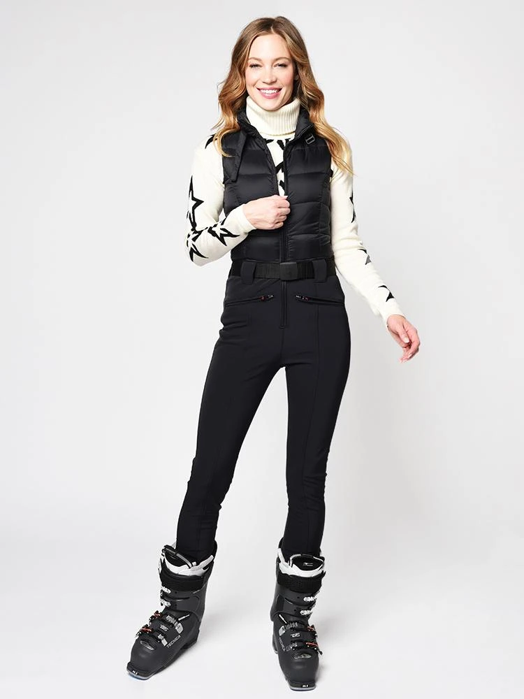 The Perfect Moment Women’s Sleeveless Super Star Ski Suit combines a quilted upper down fill vest with a Toray Primeflex 4 -Way Stretch ski pant in a form fitting, flattering cut for a streamlined look under your ski jacket or worn over a sweater on warmer days. The waterproof, breathable, stretchy, thermal fleece pant lining keeps you warm and cozy all day on the slopes.