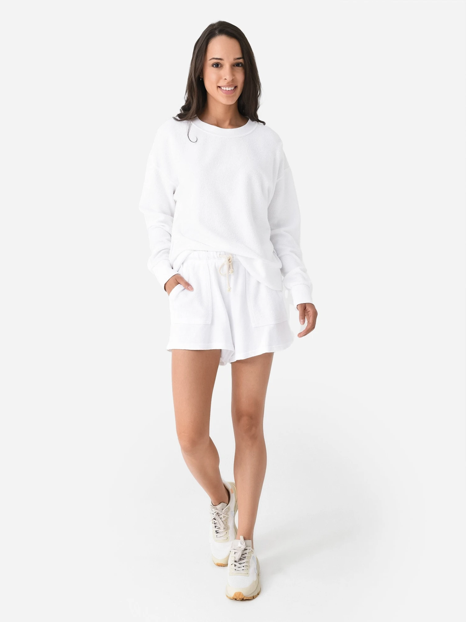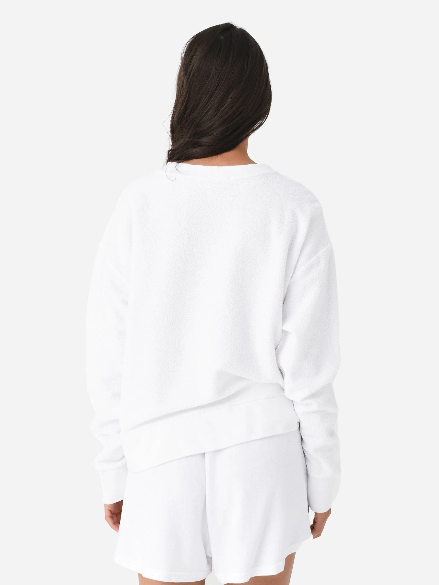 FEATURES:SweatshirtCrew NecklineDropped ShoulderLong SleeveStraight HemBanded Cuffs & HemFrench Terry Fabrication100% CottonRelaxed FitModel is wearing size Small sweatshirt.Model’s Measurements: Height: 5’8″ | Bust: 32C | Waist: 24″ | Hips: 34″ | Dress Size: 0-2 (US)