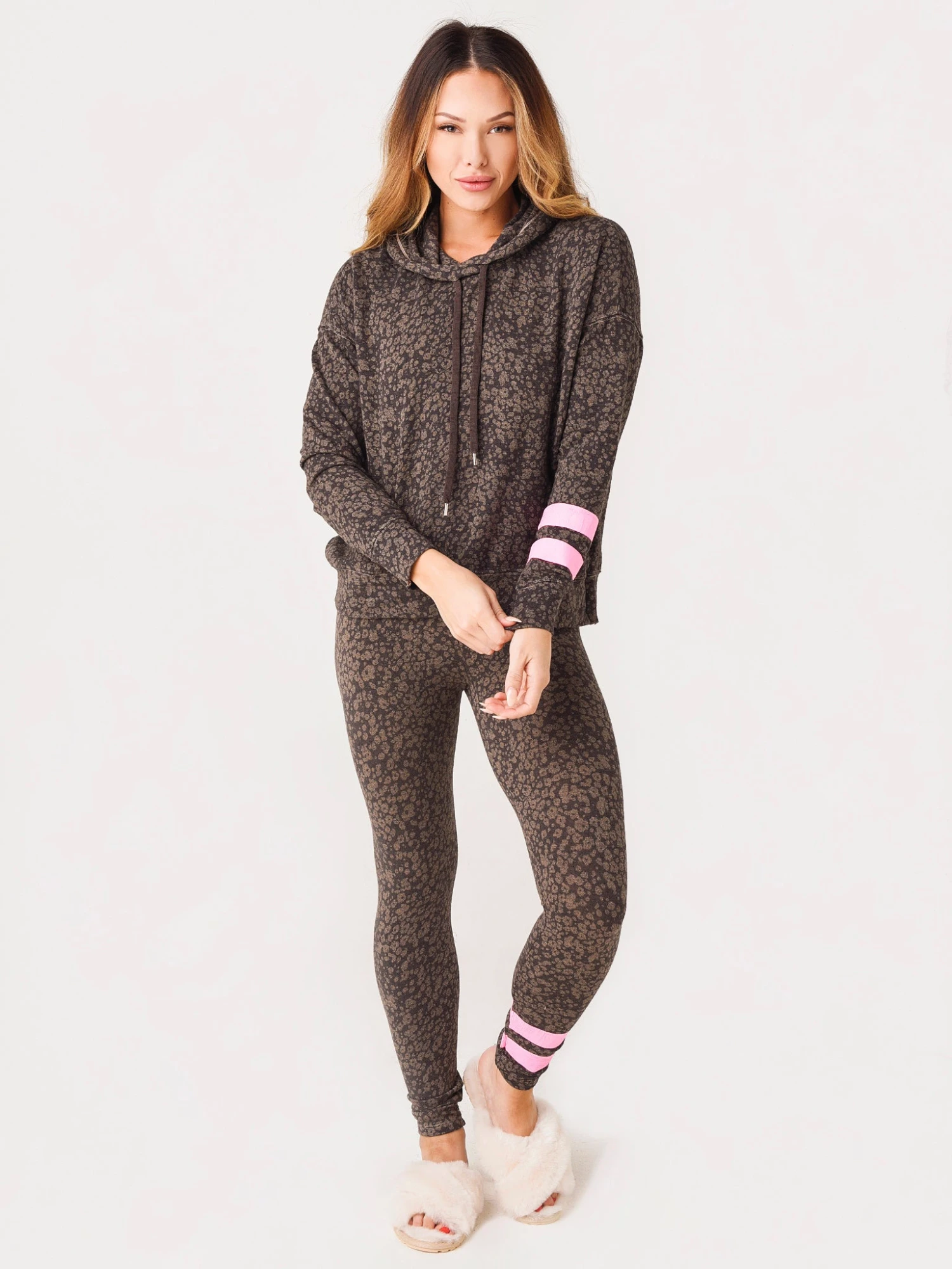 FEATURES:HoodieHigh NecklineDrawstring HoodAll-Over abstract Floral Pritn with Pink Stripe Detail at Left SleeveUltra-SoftRelaxed FitMade in USA66% Viscose, 29% Cotton, 5% SpandexModel is wearing size Small hoodie.Model’s Measurements: Height: 5’7″; Bust: 34C; Waist; 26″; Hips: 36″; Dress: 2 (US)