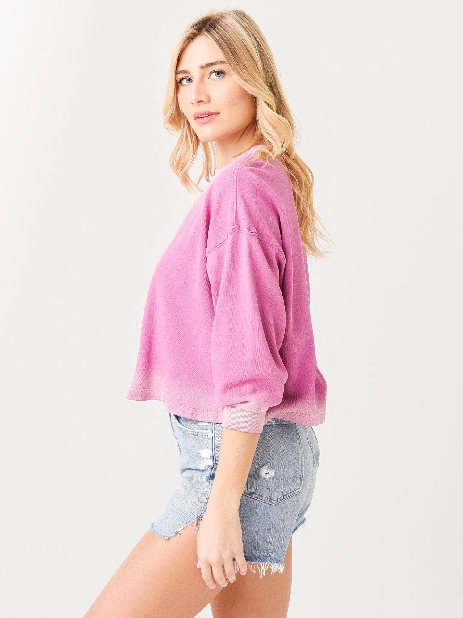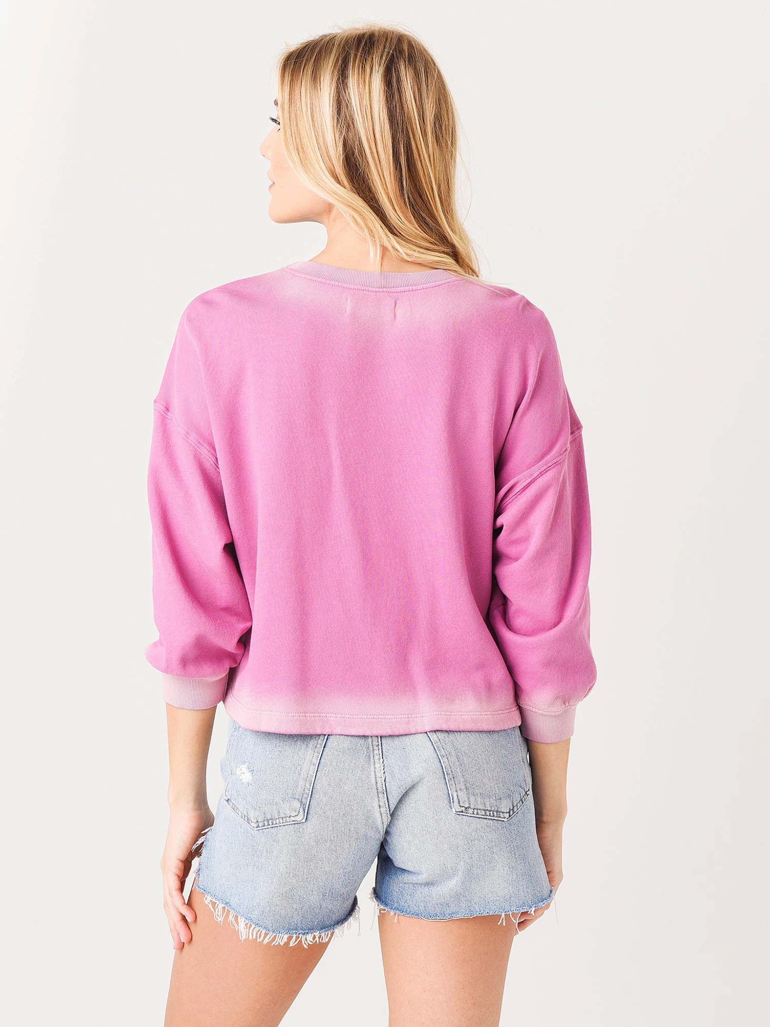 FEATURES:SweatshirtCrew NecklineDroppes-ShoulderOmbre StylingPuff SleeveRibbed Neck, and CuffsBanded HemRelaxed Fit100% CottonModel is wearing size Small sweatshirt.Model’s Measurements: Height: 5’9″; Bust: 34B; Waist: 26″; Hips: 37″; Dress Size: 2-4 (US)
