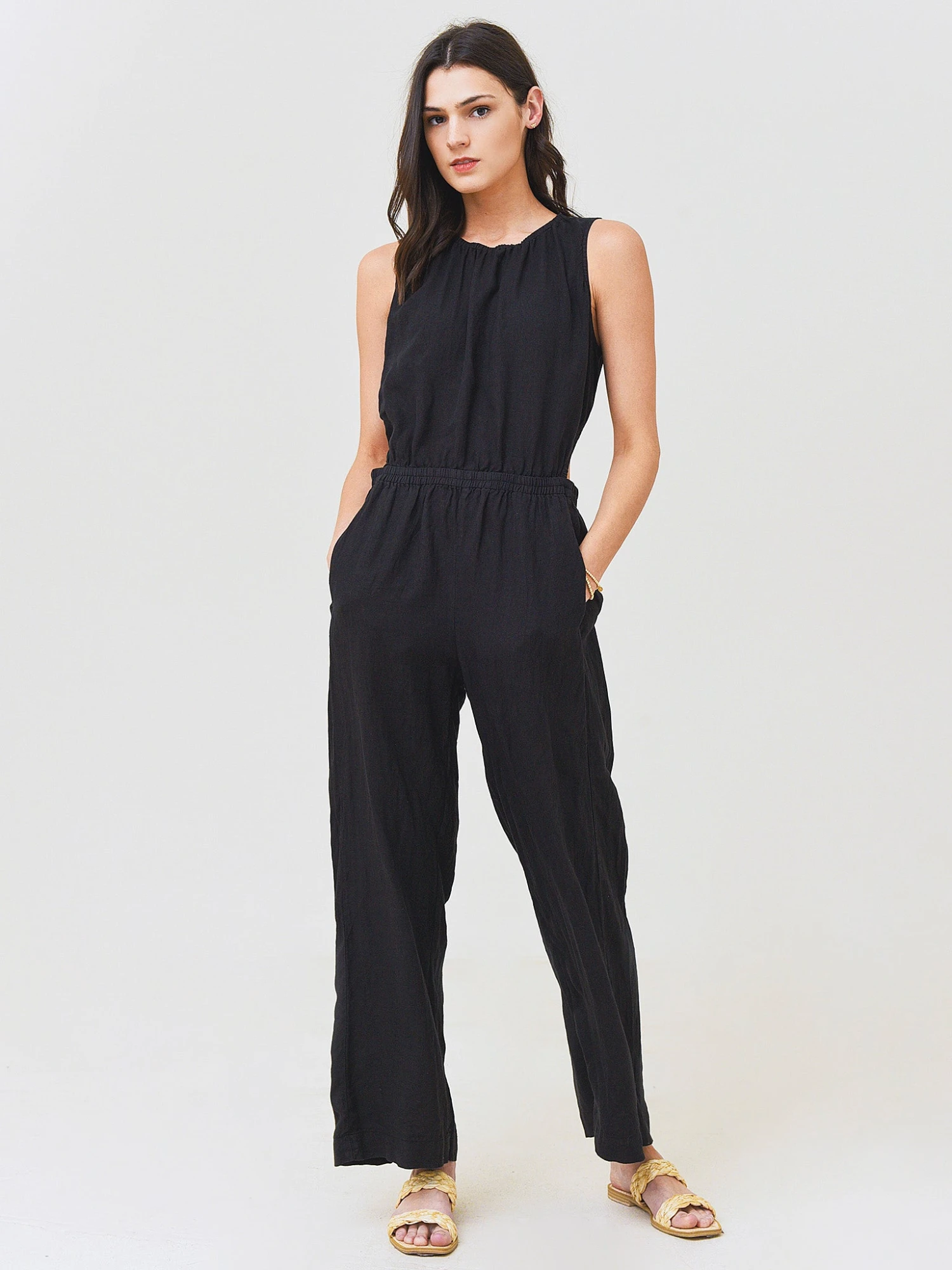 FEATURES:JumpsuitRound NecklineSleevelessBack Cut-OutElastic WaistbandRelaxed SilhouetteLightweight Fabrication100% LinenClassic FitModel is wearing size Small jumpsuit.Model’s Measurements: Height: 5’9.5″ | Bust: 34A | Waist: 26.5″ | Hips: 37″ | Dress Size: 2-4 (US)