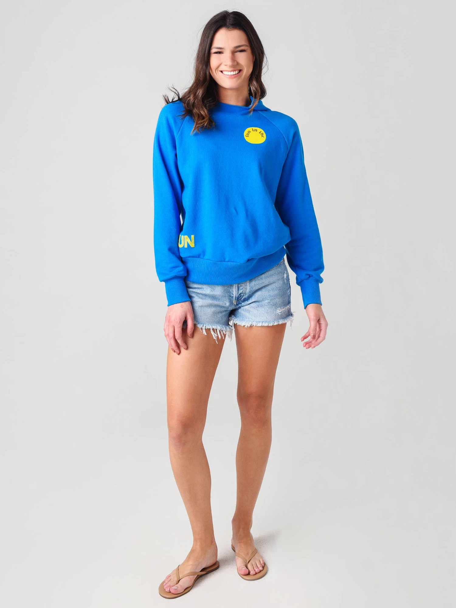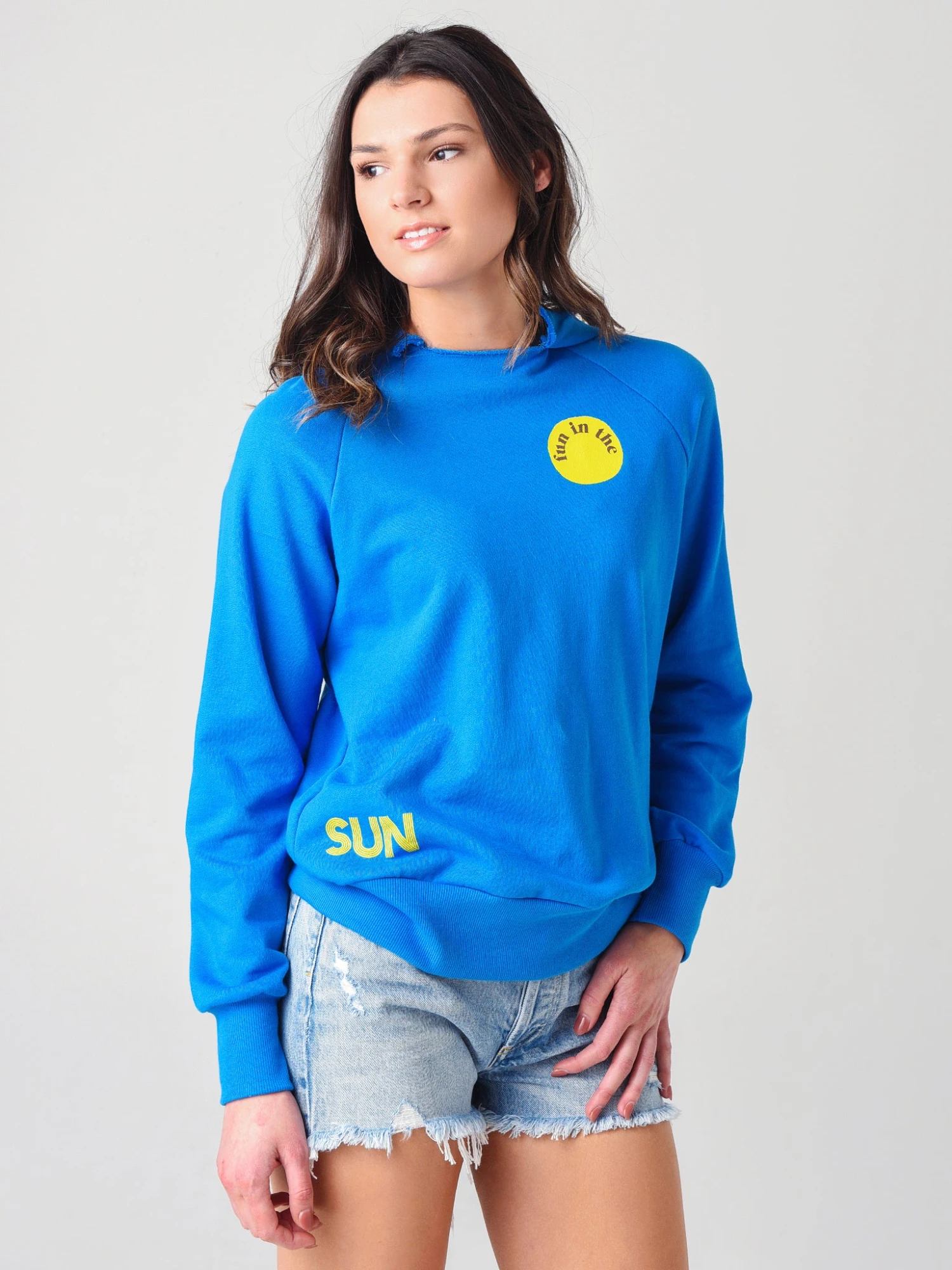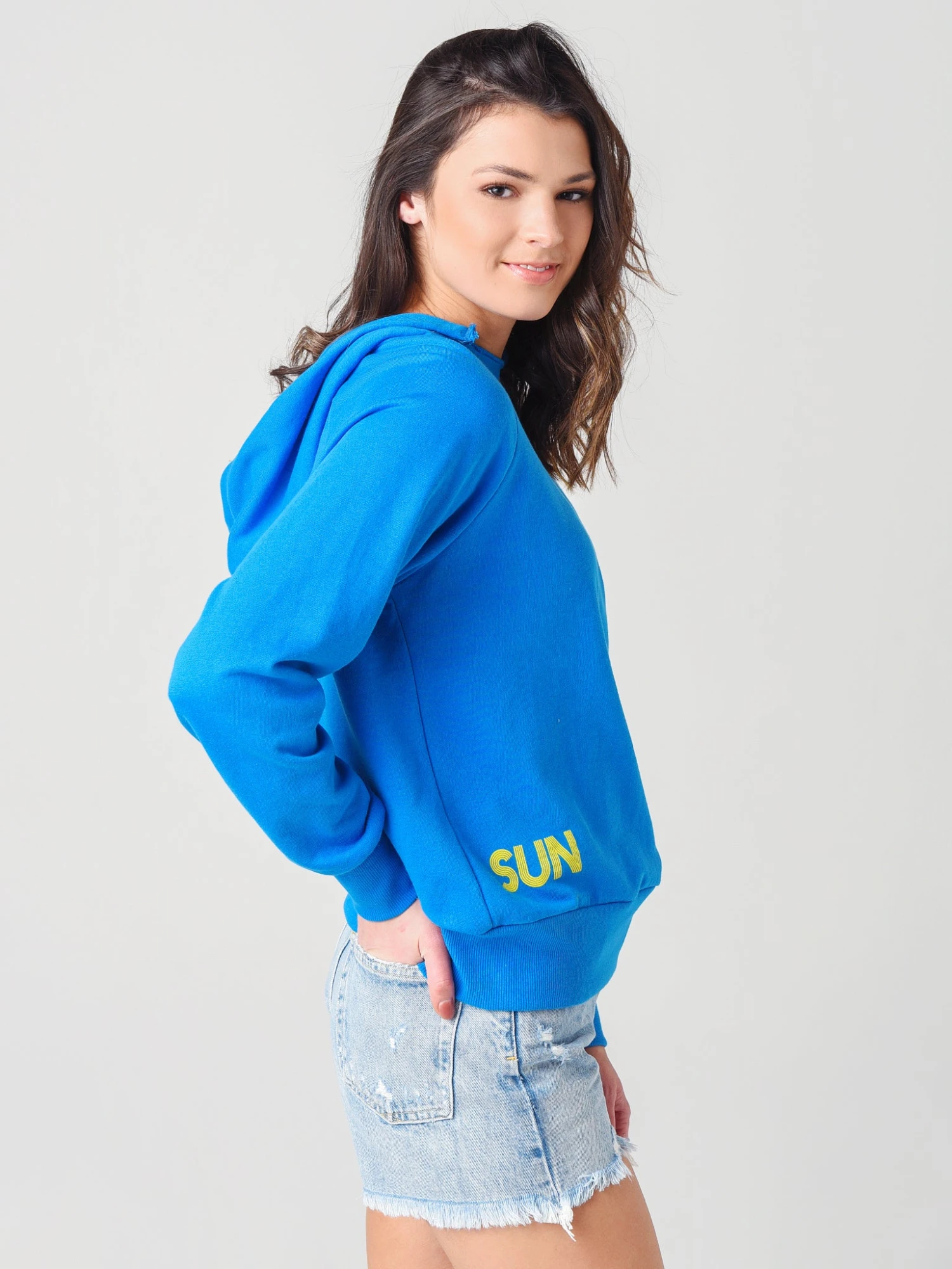 FEATURES:HoodieHigh NecklineHooded, Distressed Attached DetailRibbed Cuffs and HemFun In The Sun GraphicClassic Fit100% CottonModel is wearing size Small hoodie.Model’s Measurements: Height: 5’9.5″; Bust: 34A; Waist: 26.5″; Hips: 37″; Dress Size: 2-4 (US)