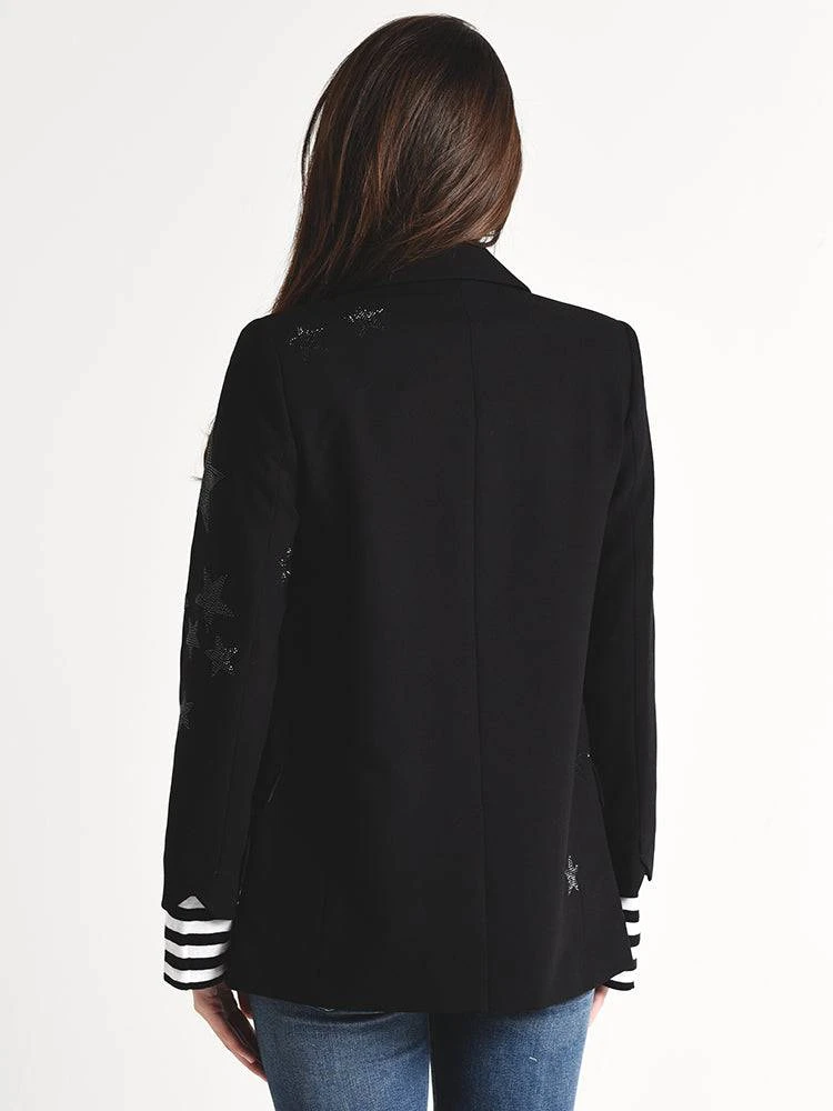 FEATURES:Blazer StylePeak lapels, long sleeves, notched cuffs, button front closuresFront flap pockets, inner slip pocket, shaping seams, back ventTonal rhinestone-star embellishments, longline silhouette, linedPolyester/viscose/elastane; body lining: viscose; sleeve lining: acetate/viscoseDry cleanImportedStyled with Citizens of Humanity Jean Style # 1416D-989 and Splendid Shoe Style # LL1433. Model is wearing size small Top and 26 Jeans.