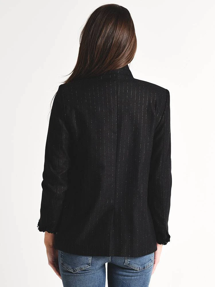 FEATURES:Blazer StyleNotched stand collar, long sleeves, frayed cuffsOpen-front silhouette, front besom pocketsAllover metallic pinstripe-printed wool blendLongline silhouette, back vent, linedWool/polyamide/acrylic/polyester/metallic fibers; trim: cotton; body lining: viscose; sleeve lining: acetate/viscoseDry cleanImportedStyled with Citizens of Humanity Jean Style # 1416D-989 and Splendid Shoe Style # LL1433. Model is wearing size small Top and 26 Jeans.